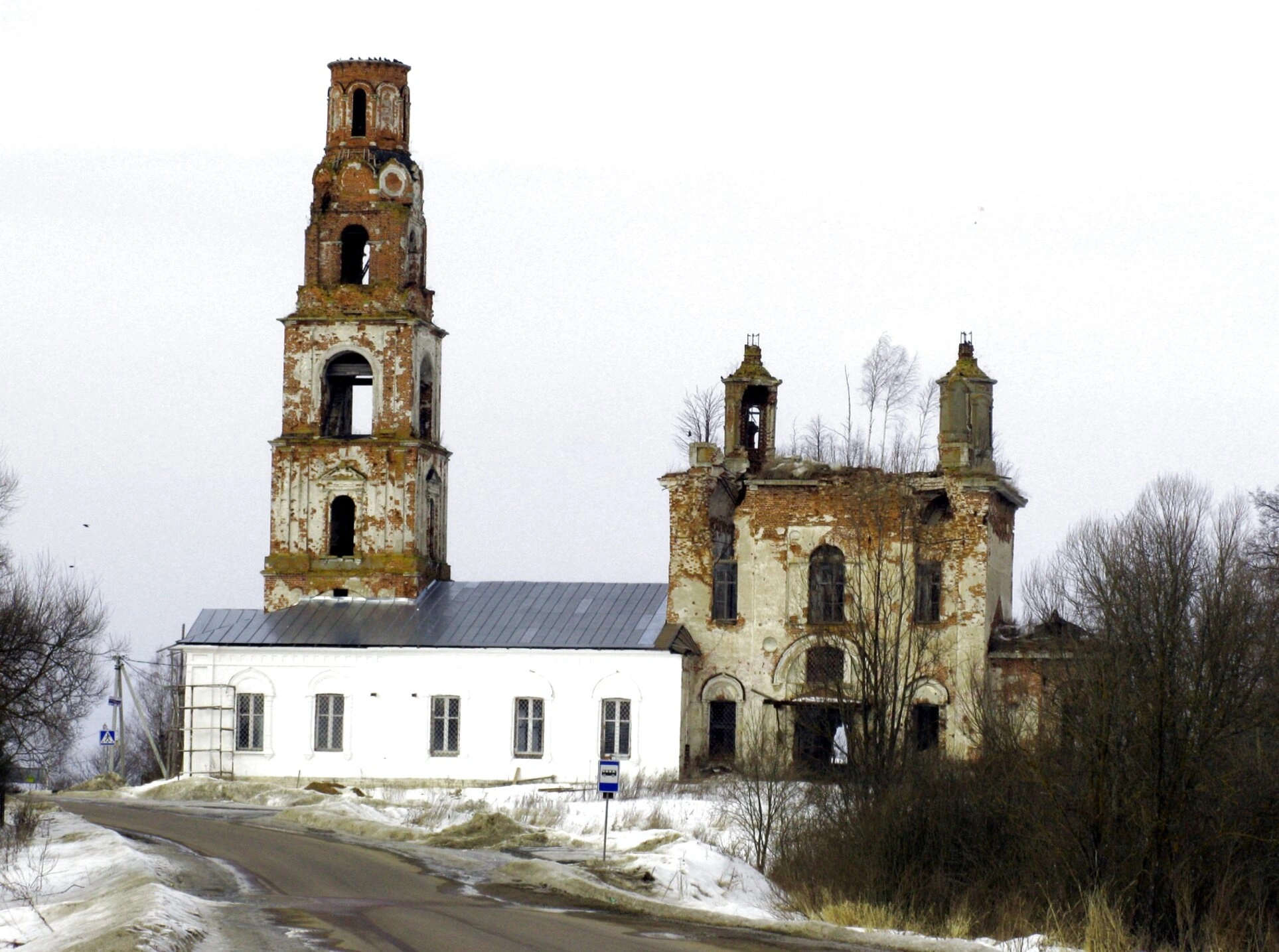 На представленной фотографии запечатлена Церковь Вознесения Господня, расположенная в селе Теряево Волоколамского городского округа Московской области. Храм находится в полуразрушенном состоянии, что придаёт его облику величие скорби и напоминает о бренности земного бытия.