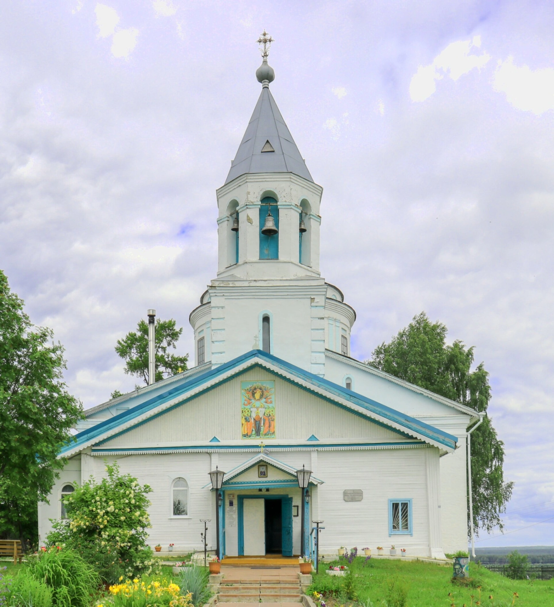 На заднем плане открывается вид на густую зелень деревьев и пасмурное небо, характерное для северных широт России. Церковь Вознесения Господня в Ыбе была построена в 1825 году на средства прихожан и является одной из старейших в регионе. Она пережила разные периоды истории, оставаясь местом молитвы и духовного утешения для верующих. Храм освящён в честь великого праздника Вознесения Господня, который символизирует завершение земного служения Спасителя и обожение человеческой природы. Сегодня этот храм не только является действующим приходом, но и объектом культурного наследия, привлекающим паломников и туристов, желающих соприкоснуться с историей и духовными традициями древнего комиского края.
