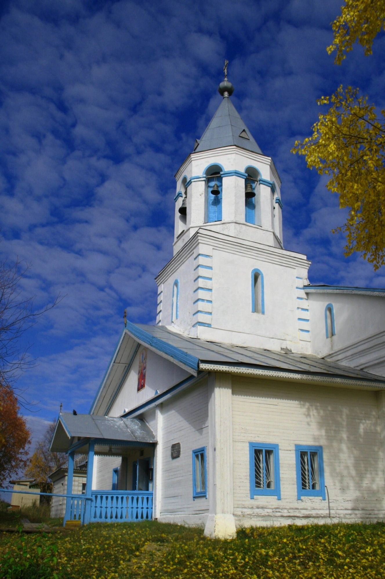 Храм увенчан стройной колокольней, завершающейся шатровым куполом и золочёной луковичной главкой, над которой вознесён православный крест, сияющий в лучах осеннего солнца. Снимок сделан в прекрасный погожий день ранней осени, о чём свидетельствуют пожелтевшие листья на деревьях и опавшая листва, устилающая землю у подножия церкви.