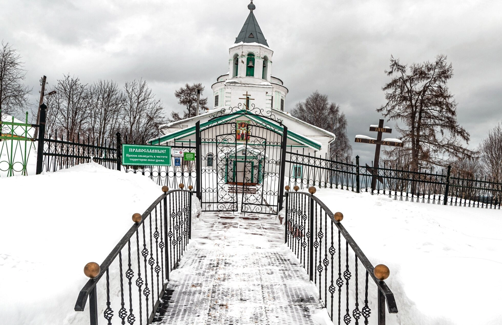 На переднем плане снимка видна аккуратно вымощенная дорожка, ведущая к святому месту. Она символизирует путь верующего к Богу и приглашает каждого войти под церковные своды. Сам храм выполнен в традиционном стиле и окрашен в белый цвет, олицетворяющий духовную чистоту и благодать. Голубые элементы декора и синяя крыша гармонично дополняют его облик, создавая ощущение небесной лёгкости и устремлённости ввысь.