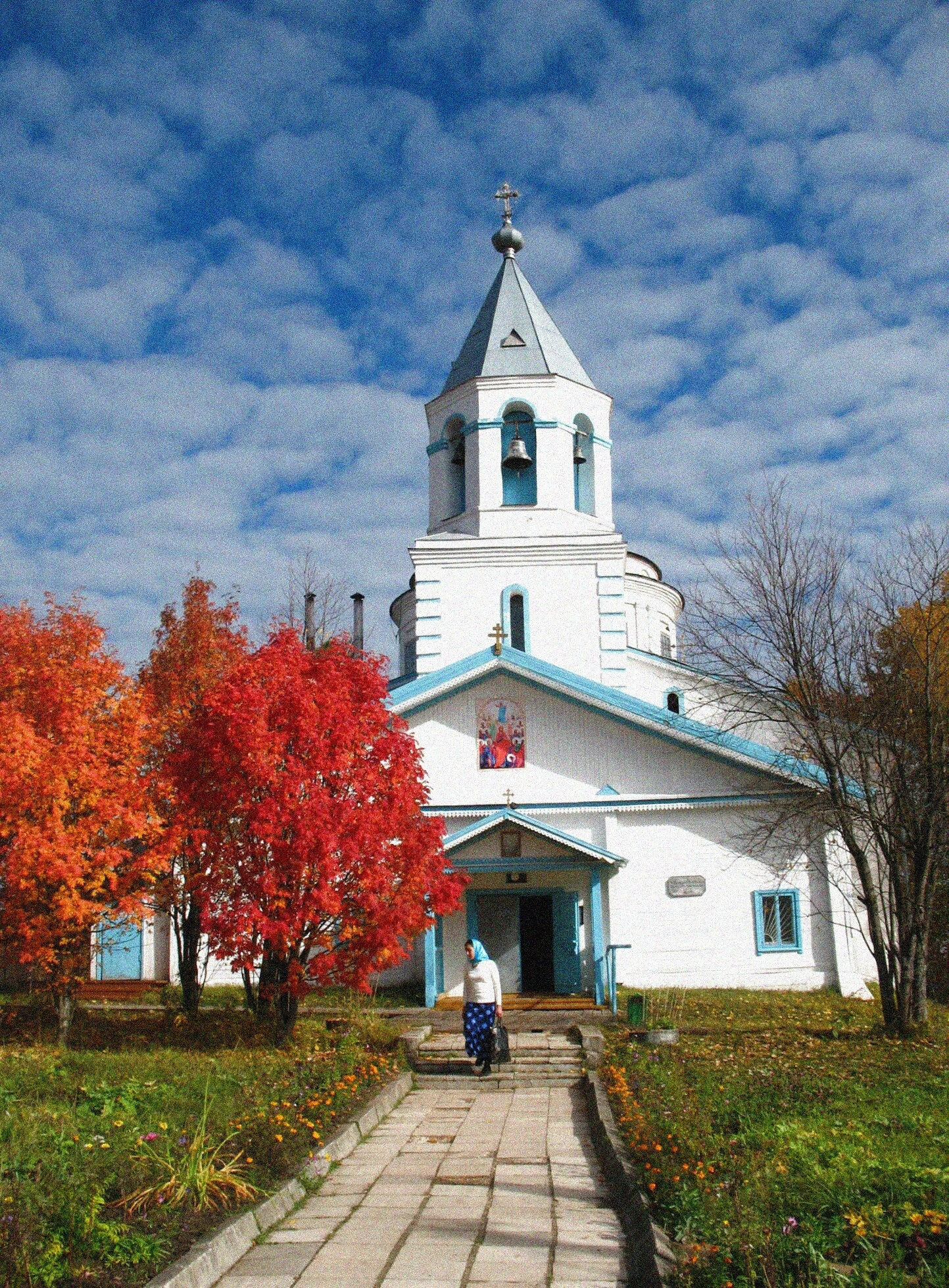 К главному входу в дом Божий ведёт аккуратно вымощенная камнем дорожка, по которой в момент съёмки следует прихожанин. Это символический путь верующего человека к храму, к молитве и спасению. Чистое голубое небо с легкими белыми облаками осеняет собой всю эту благодатную картину, наполняя её светом и божественным спокойствием.