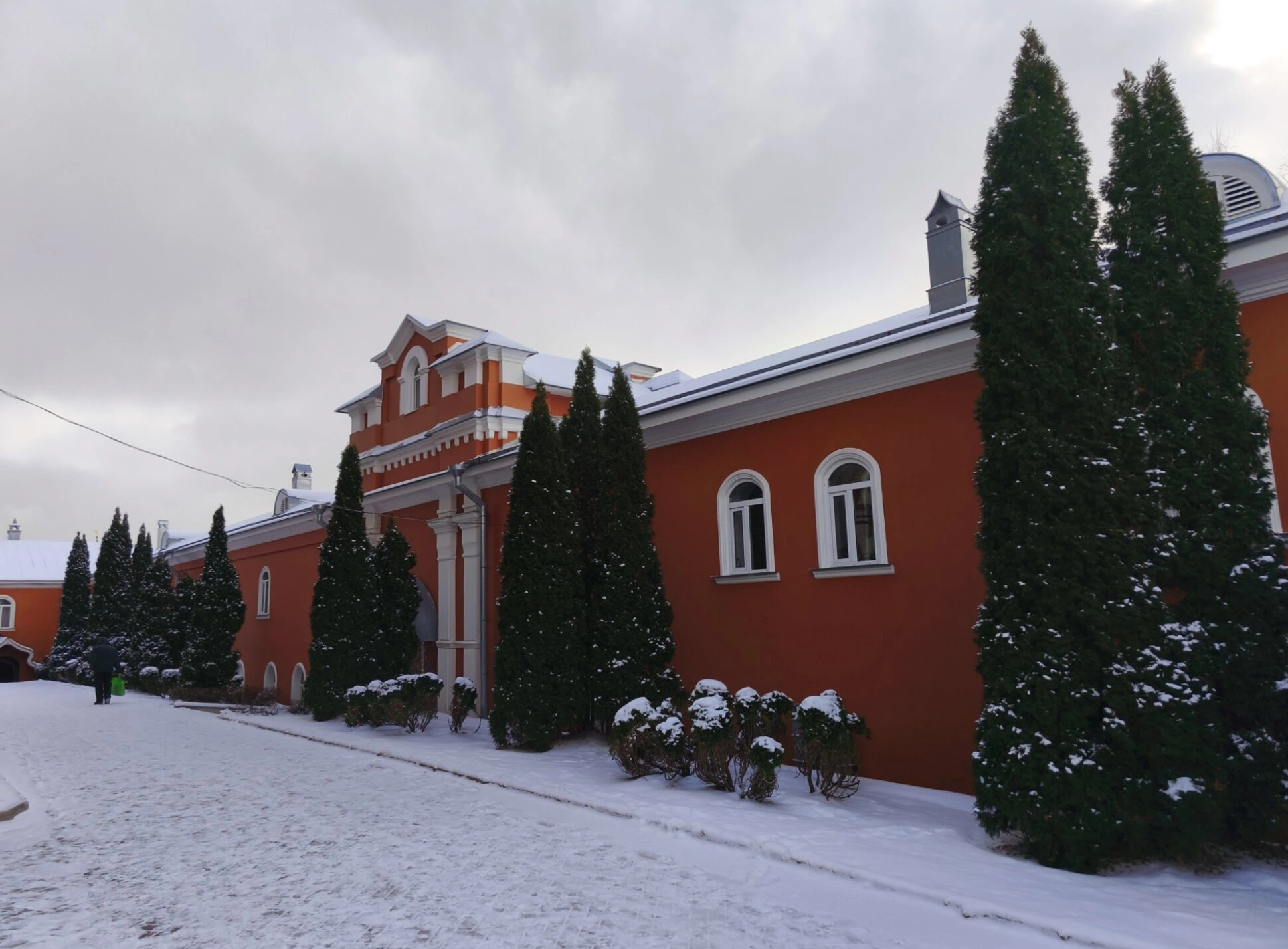 Представленная фотография запечатлела Церковь Вознесения Господня в подмосковном Сергиевом Посаде в дни зимнего умиротворения. Святыня, относящаяся к объектам культурного наследия этого древнего православного центра, предстаёт в тихом благолепии под сенью пасмурного неба. Её фасад, выкрашенный в тёплый и глубокий красный цвет, являет собой символ духовной радости и торжества жизни во Христе. Белоснежные обрамления арочных окон и скромный фронтон в центральной части придают облику храма строгую, классическую завершённость, характерную для многих церковных строений этих мест.