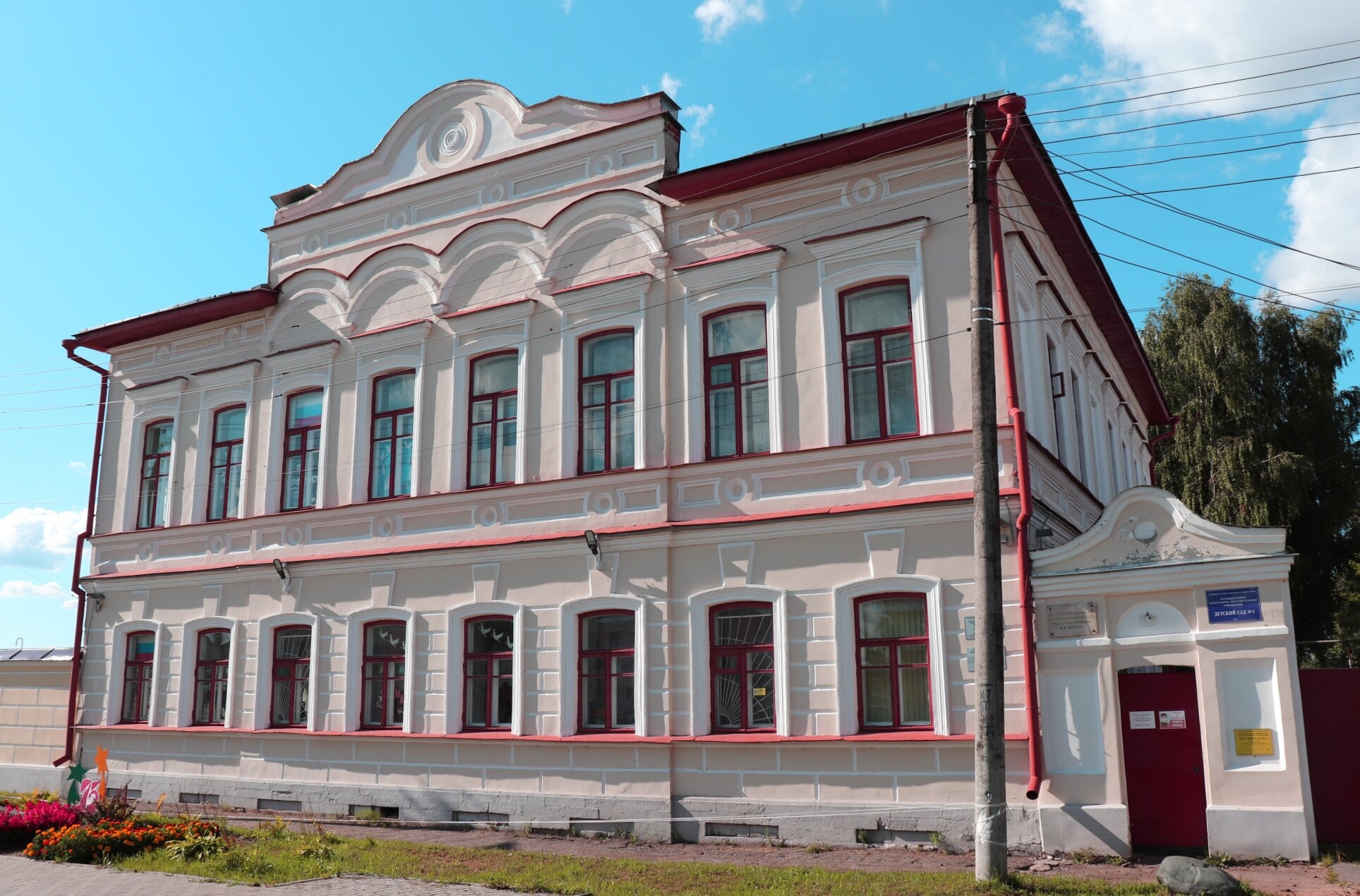 Перед храмом разбит ухоженный газон с цветочной клумбой, создающий благолепную атмосферу вокруг церковного здания. Справа от храма растет дерево, добавляющее природной гармонии в архитектурный ансамбль. На заднем плане фотографии видно голубое небо с облаками, что свидетельствует о ясной погоде в момент съемки.