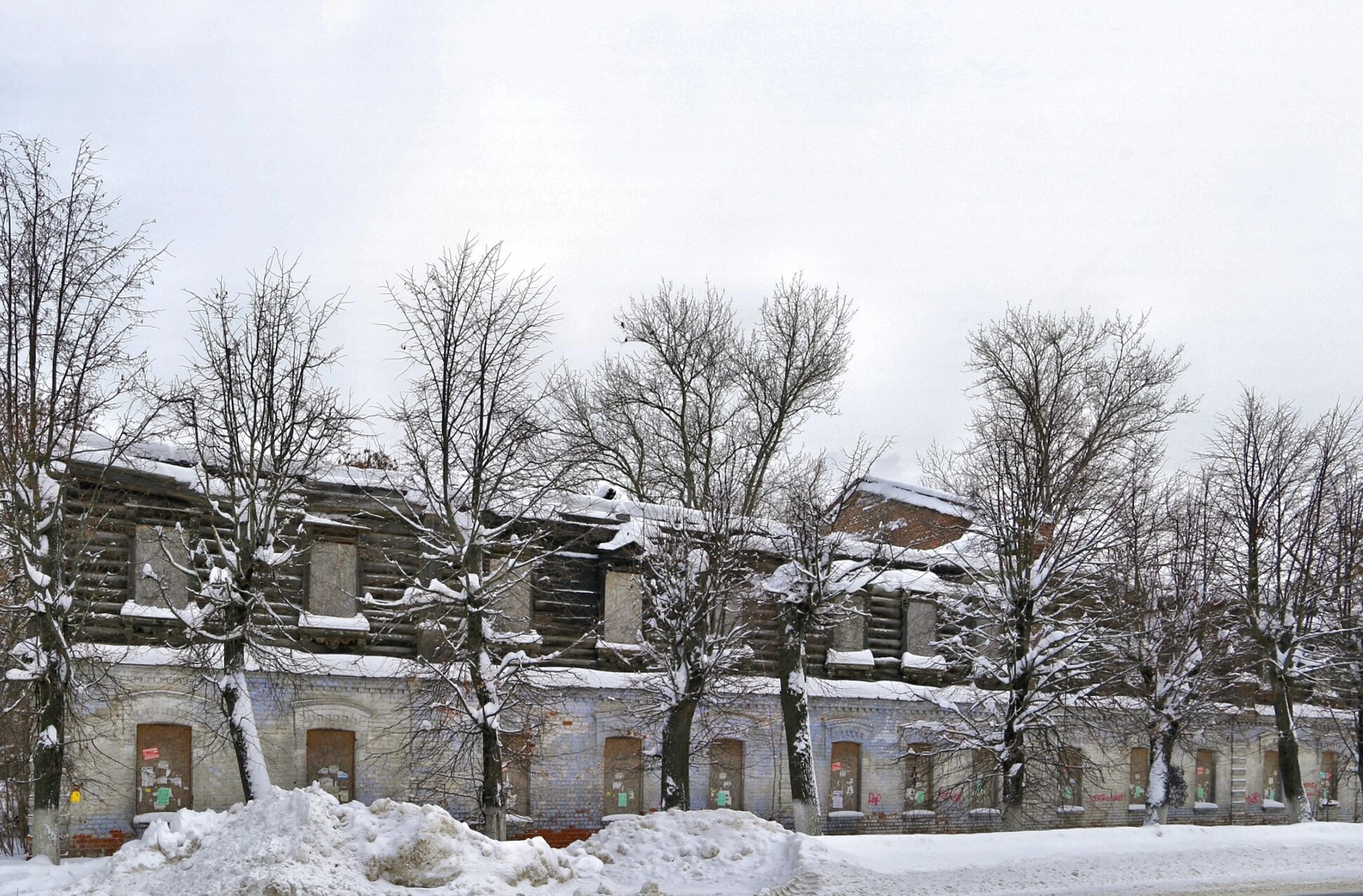 Окружающий пейзаж дополняет атмосферу русского зимнего дня: вдоль дороги лежат глубокие сугробы, несколько лиственных деревьев с оголёнными ветвями, также покрытыми снегом, стоят на переднем плане. Пасмурное небо с серыми облаками усиливает ощущение зимней строгости и покоя.