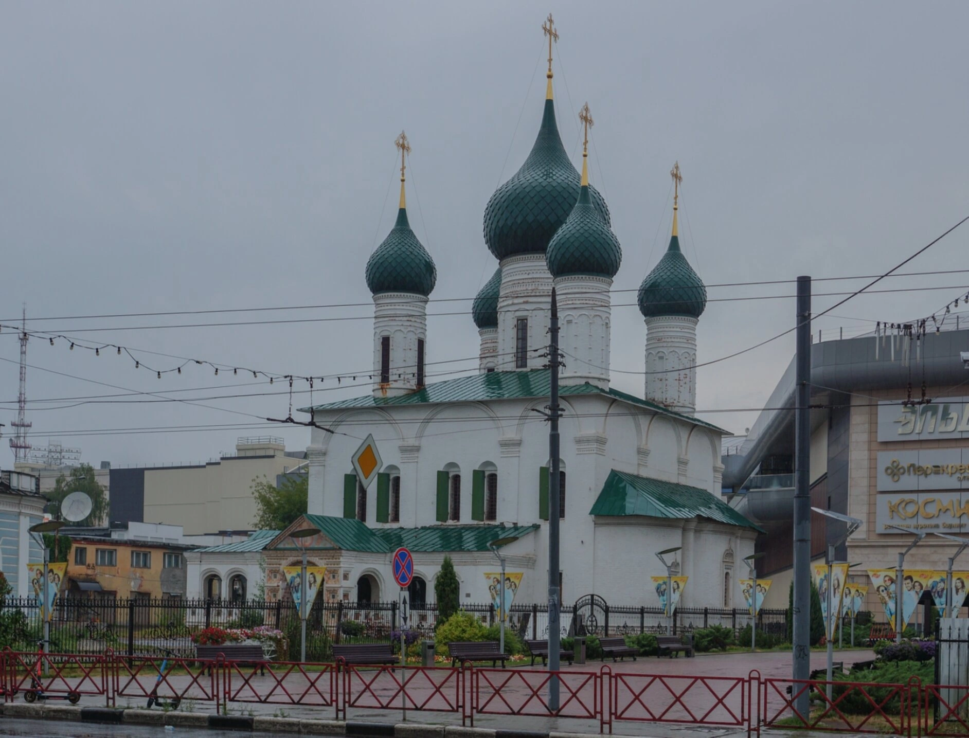 На представленной фотографии запечатлена Церковь Вознесения Господня, один из выдающихся православных храмов Ярославля. Белоснежный пятиглавый храм, увенчанный зелёными куполами с сияющими золотыми крестами, величественно возвышается на фоне городского пейзажа. Его архитектурный облик, характерный для русского церковного зодчества, создаёт ощущение благодати и вечности.