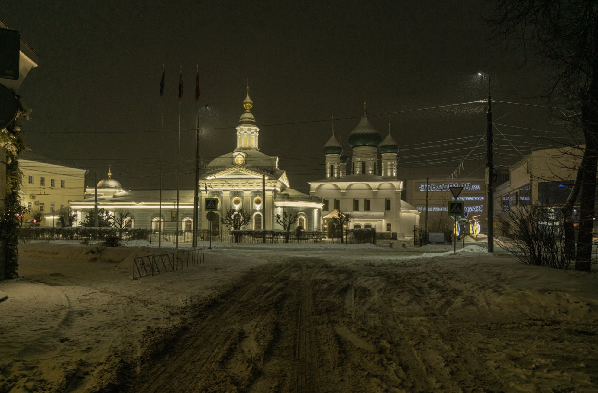 На фотографии запечатлен архитектурный ансамбль Вознесенско-Сретенского прихода в Ярославле, вид с южной стороны в зимнее ночное время. Величественный пятиглавый храм, освещенный в ночи, представляет собой выдающийся памятник церковной архитектуры, характерный для ярославской строительной традиции последней четверти XVII века.
