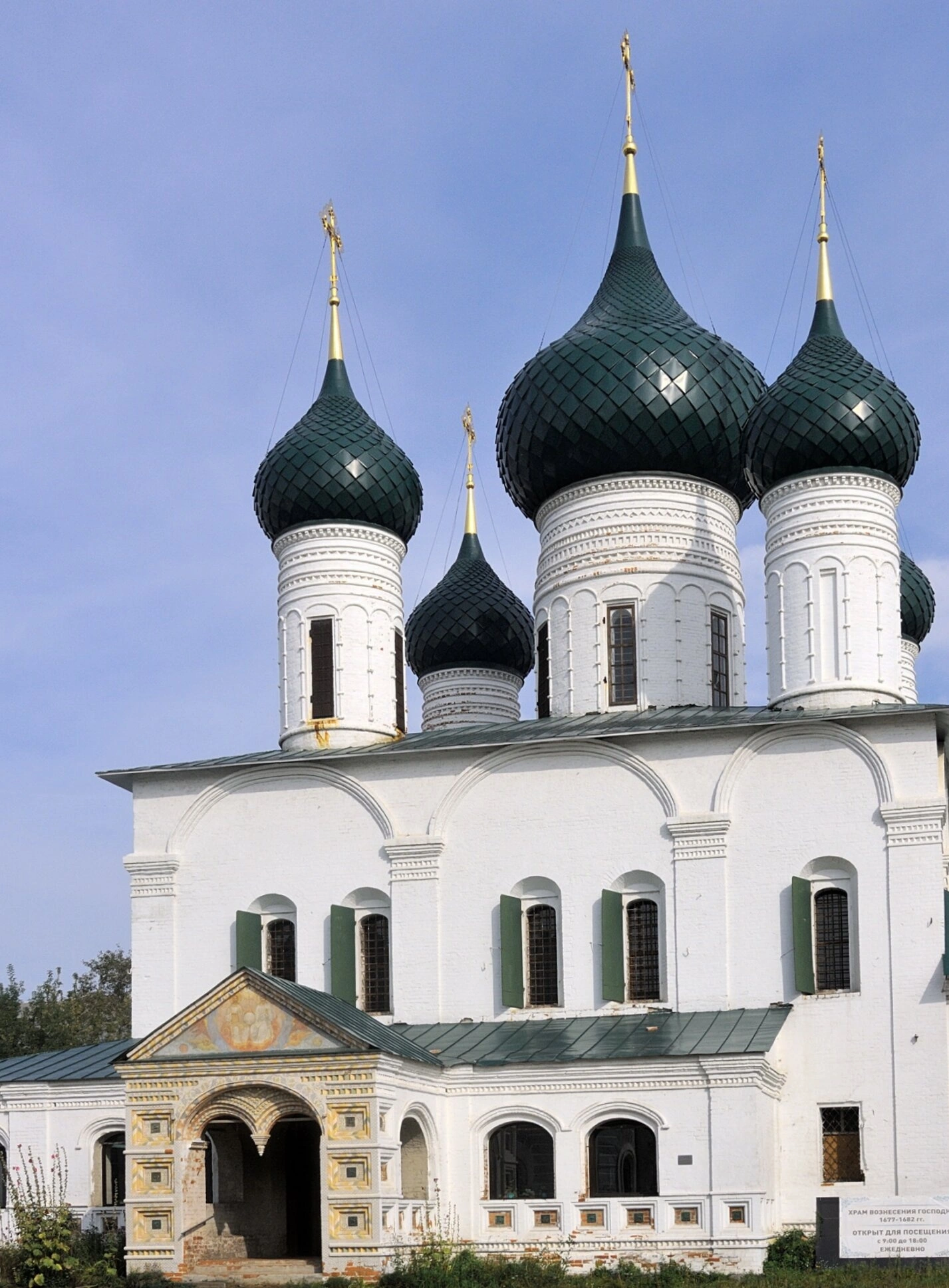 На представленной фотографии запечатлена Церковь Вознесения Господня, что возвышается в историческом центре Ярославля. Белоснежный каменный храм, украшенный тёмно-зелёными куполами, увенчанными златыми крестами, являет собой прекрасный образец русского церковного зодчества. Его стройный силуэт устремлён ввысь, к ясному голубому небу, символизируя духовное вознесение.
