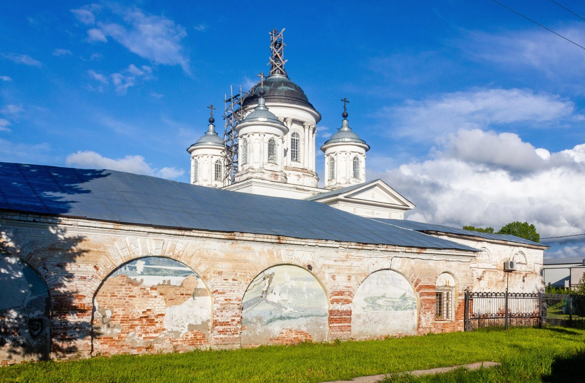 За стеной открывается вид на основной объём храма, увенчанный несколькими куполами, которые символизируют Господа Иисуса Христа и четырёх евангелистов. Состояние сооружения указывает на проведение реставрационных работ, направленных на сохранение этой православной святыни для будущих поколений.