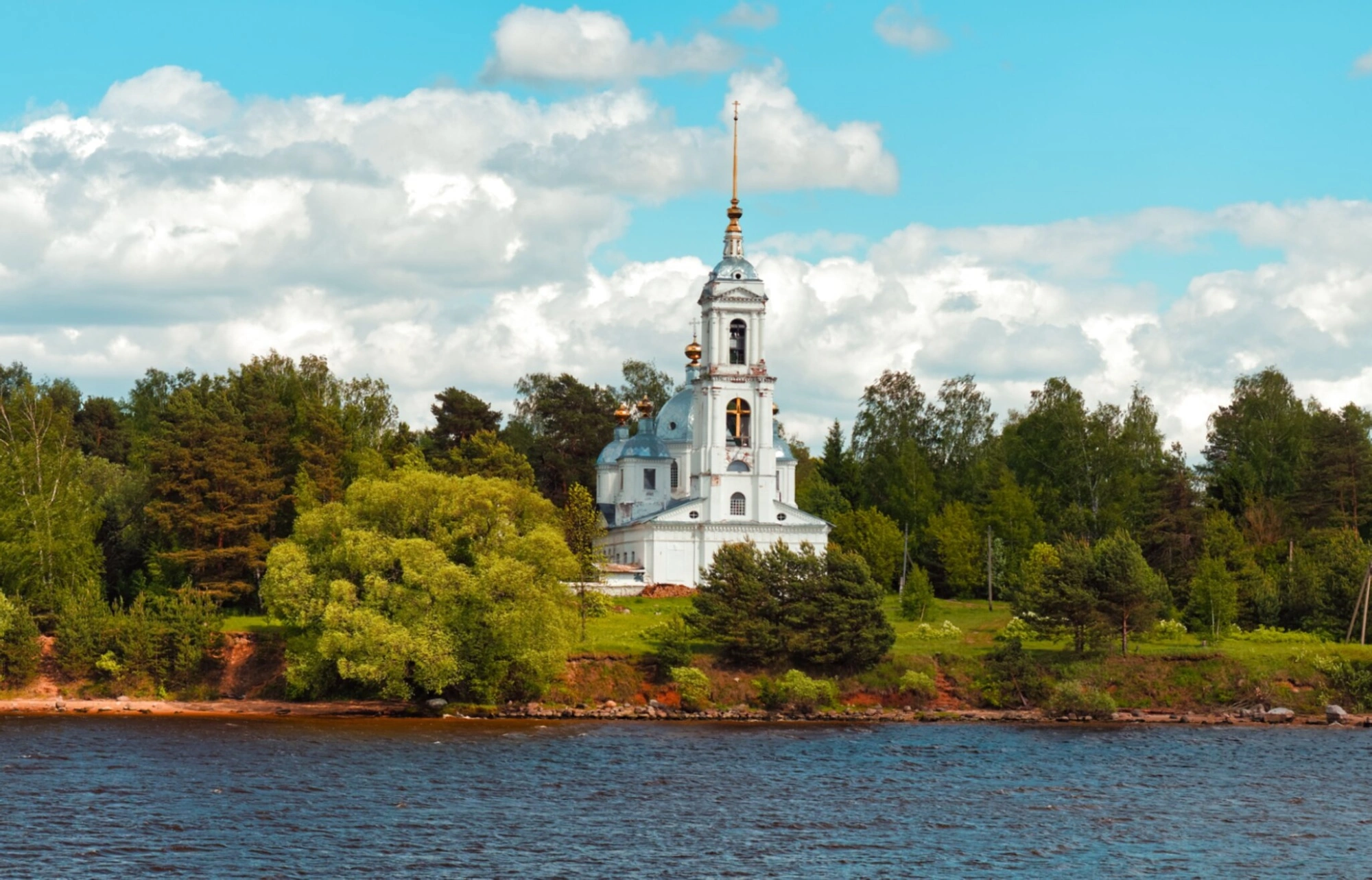 Фотография сделана с водной поверхности Волги, что позволяет увидеть храм во всей его красе. Белоснежное здание с высокой колокольней, увенчанной шпилем и крестом, и несколько золотых куполов ярко выделяются на фоне сочной зелени деревьев и кустарников. Берег реки пологий, покрытый разнотравьем, а водная гладь занимает нижнюю часть кадра. Небо в день съёмки чистое, голубое, с пышными белыми кучевыми облаками, что подчёркивает благодатность места.