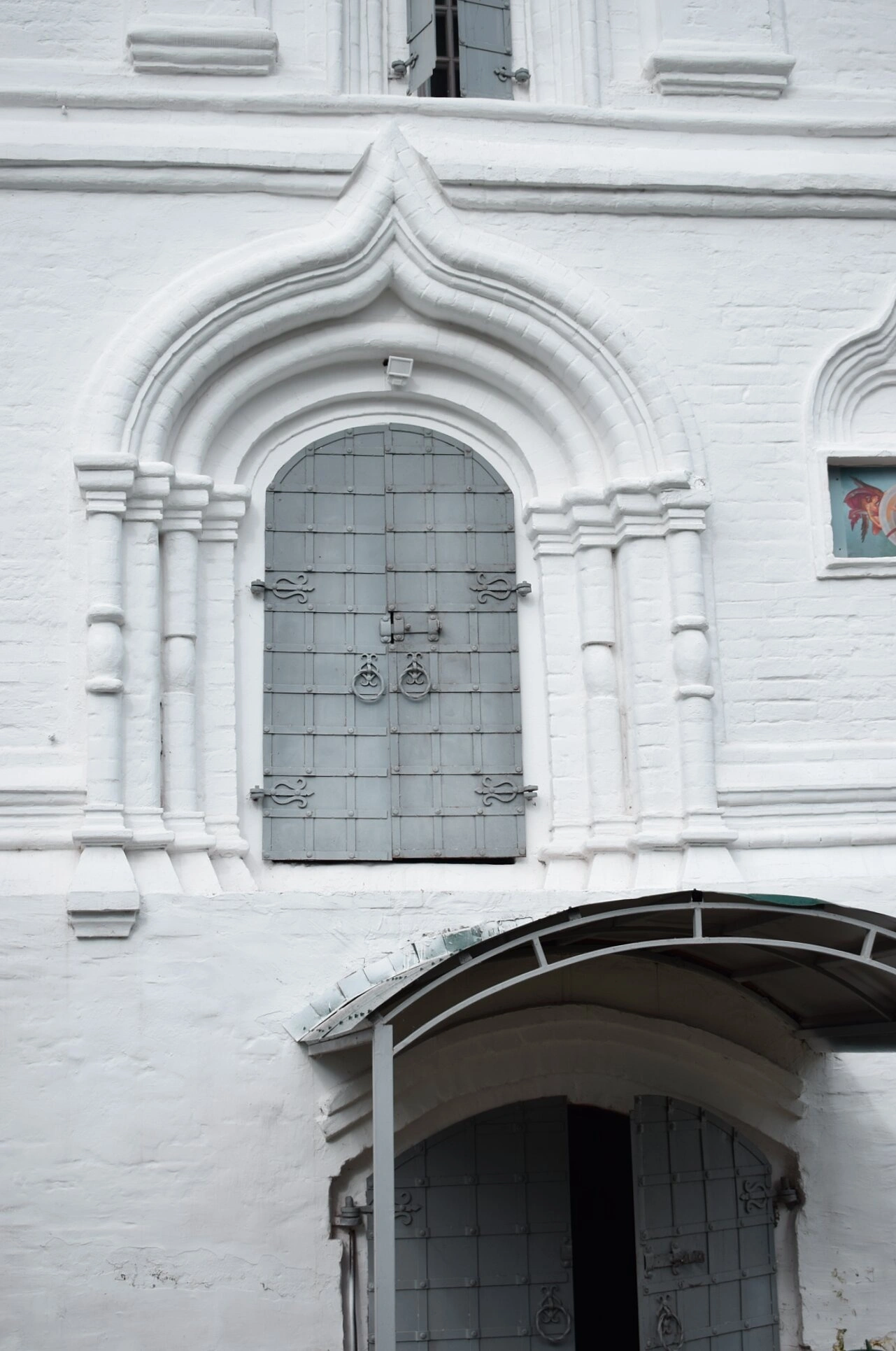 Слева от входа расположено высокое узкое окно, также имеющее арочное завершение, которое перекликается с формой двери. Окна такого типа характерны для ярославской и костромской школ зодчества и предназначены для освещения внутреннего пространства храма, создавая особую игру света и тени, способствующую молитвенному настрою. Справа видна округлая архитектурная деталь, возможно, элемент декоративного оформления или основание барабана одной из глав храма.