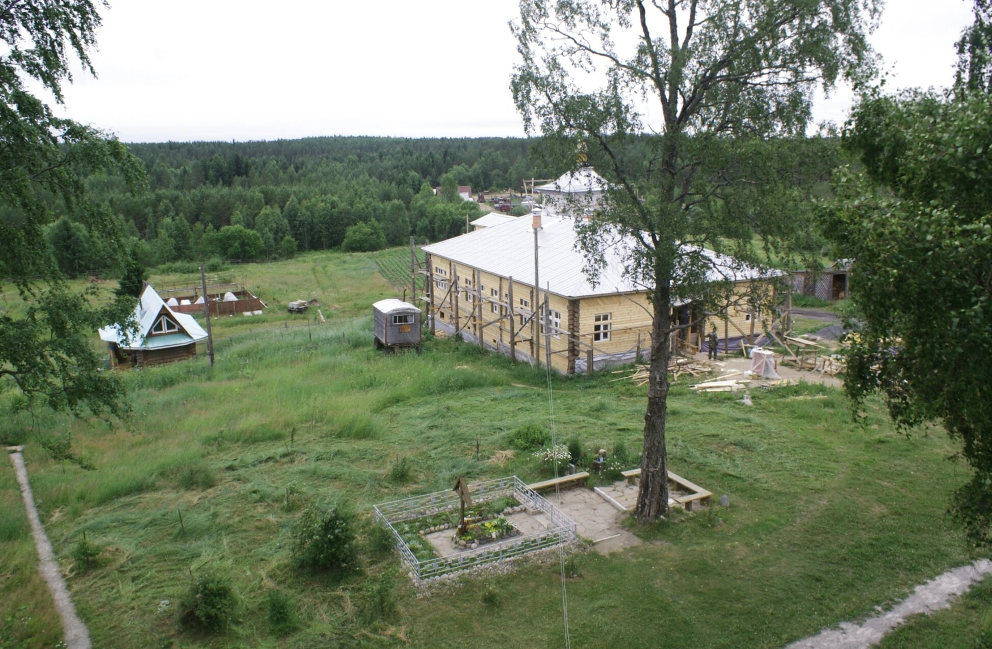 Окружающий ландшафт составляет просторная поляна с естественным травяным покровом, обрамлённая величественным хвойным лесом, характерным для карельской природы. Густой лесной массив на заднем плане создаёт ощущение уединённости и молитвенной сосредоточенности, что соответствует духу монашеской жизни. На территории также видны хозяйственные постройки монастыря, необходимые для жизнеобеспечения обители.