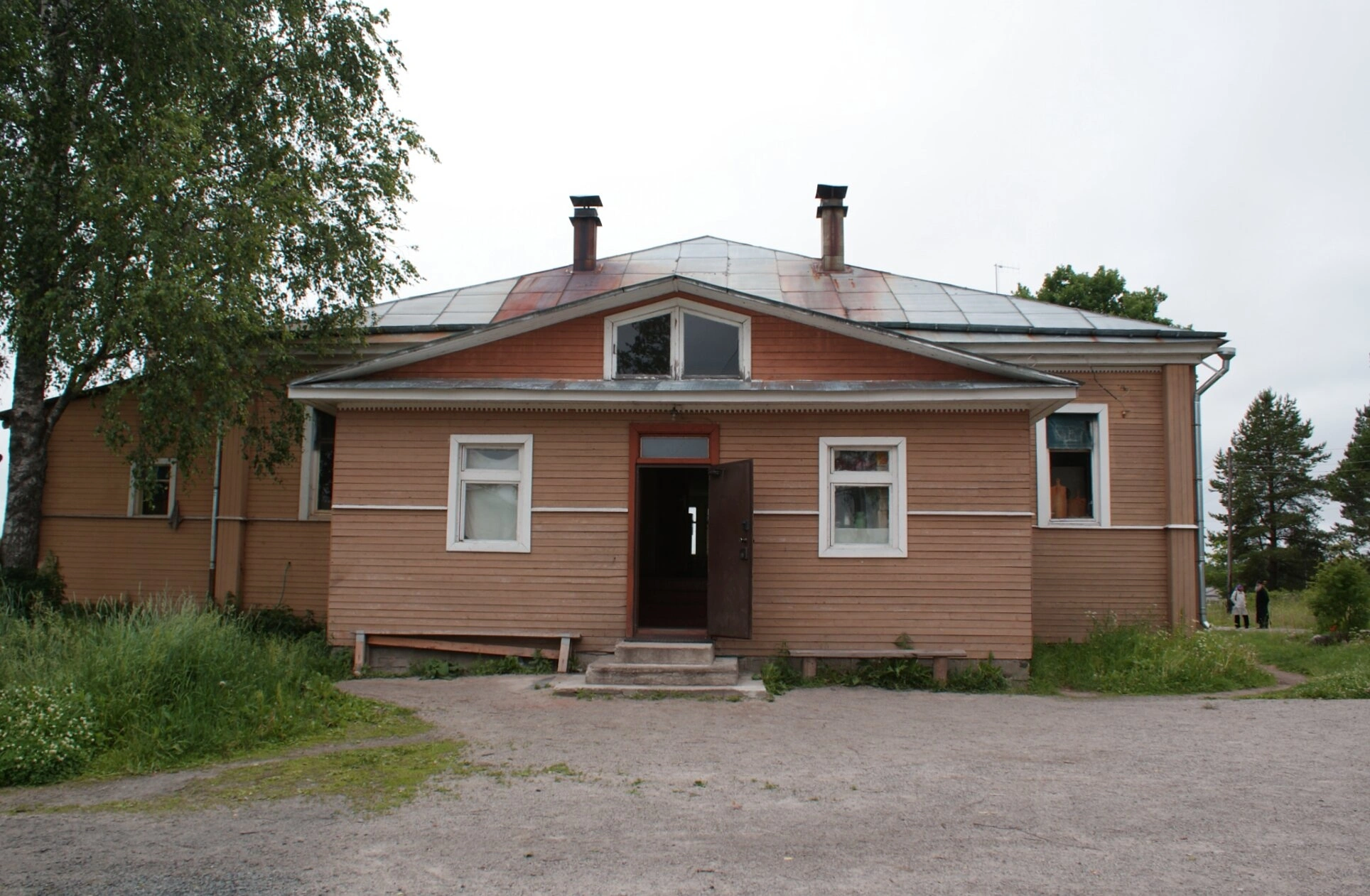 Перед храмом простирается грунтовая площадка с редкой травяной растительностью, а по сторонам возвышаются деревья, обрамляющие церковь живописным естественным окружением. Открытая входная дверь символически указывает на гостеприимство святой обители и готовность принимать верующих.