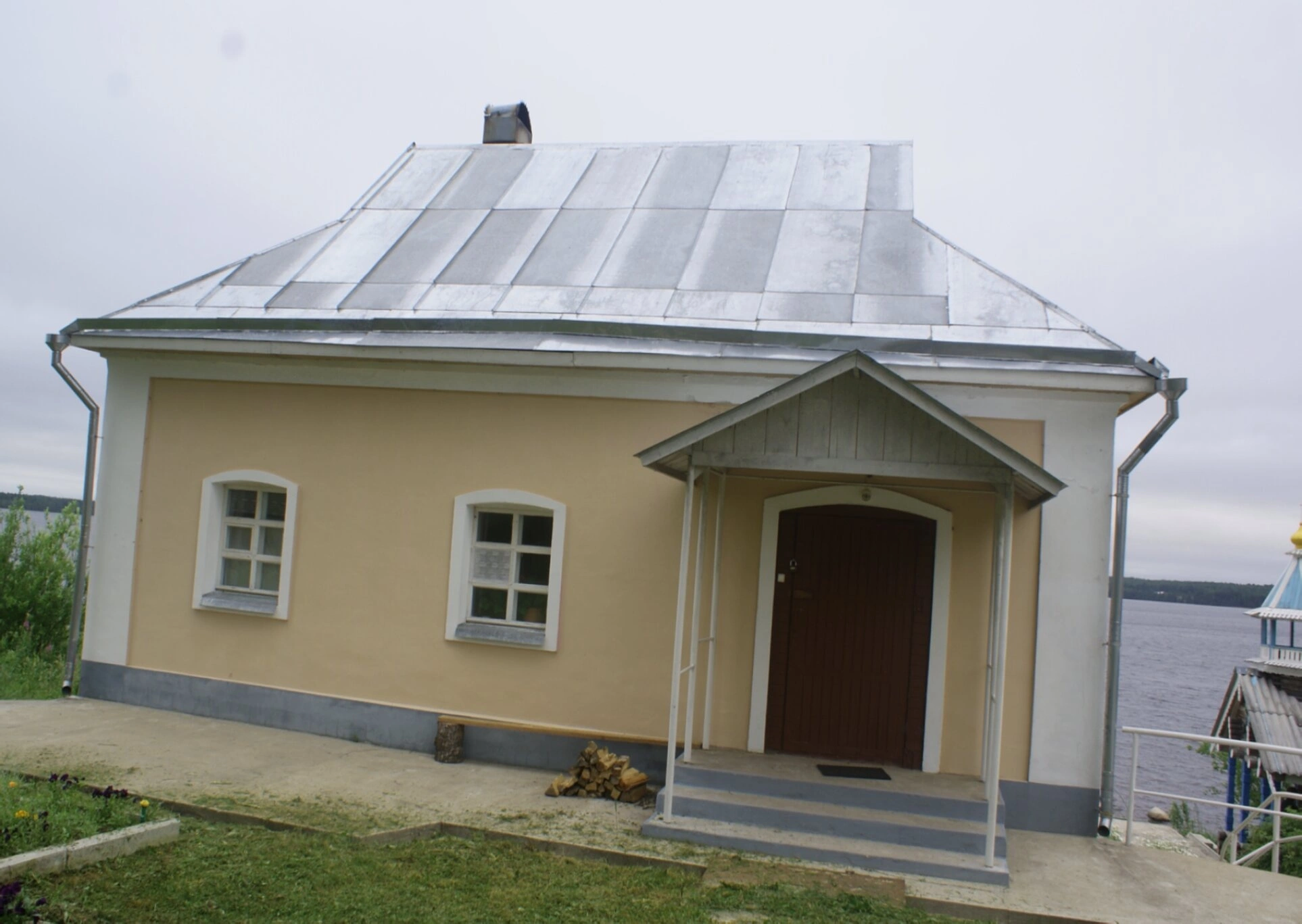 На представленной фотографии запечатлена Церковь Всех Святых, расположенная на территории Спасо-Преображенского Важеозерского мужского монастыря в Республике Карелия. Храм представляет собой одноэтажное здание скромных архитектурных форм, выполненное в традициях русского церковного зодчества.
