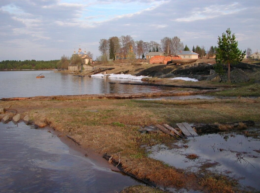 Снимок выполнен с береговой линии, где на переднем плане видны остатки древних деревянных сооружений и прибрежная растительность, частично подтопленная водами озера. Эти элементы создают ощущение связи времён и напоминают о многовековой истории этого святого места.