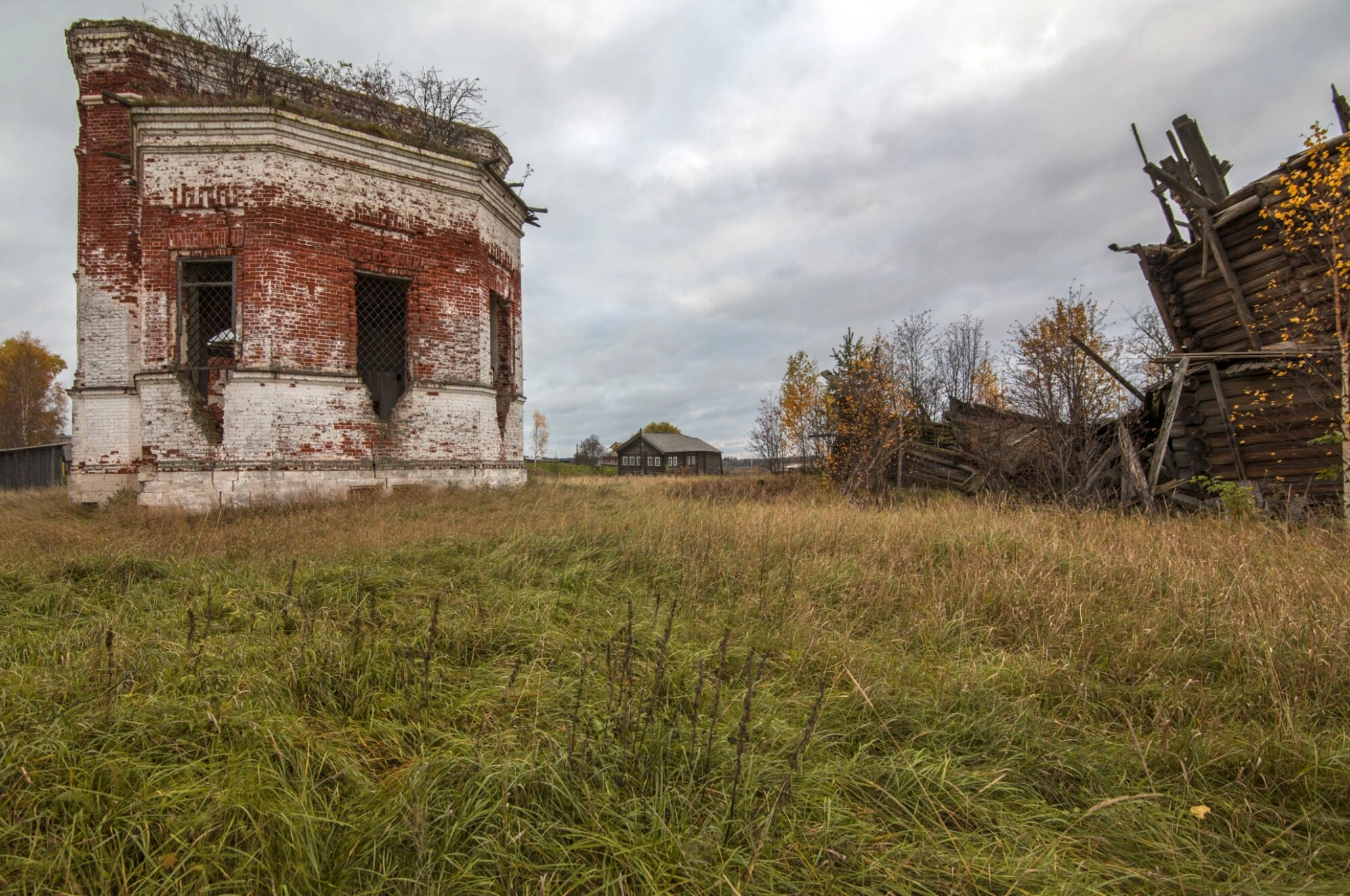 Окружающая храм местность представляет собой заросшее поле с высокой травой, что подчеркивает заброшенность этого некогда духовного центра. На заднем плане просматриваются деревья с пожелтевшей листвой, указывающие на осенний период съемки. Вдали visible еще одно деревянное строение, вероятно, жилой дом местных жителей. Пасмурное небо, затянутое серыми облаками, создает melancholic настроение и усиливает впечатление утраты этого памятника православной культуры.