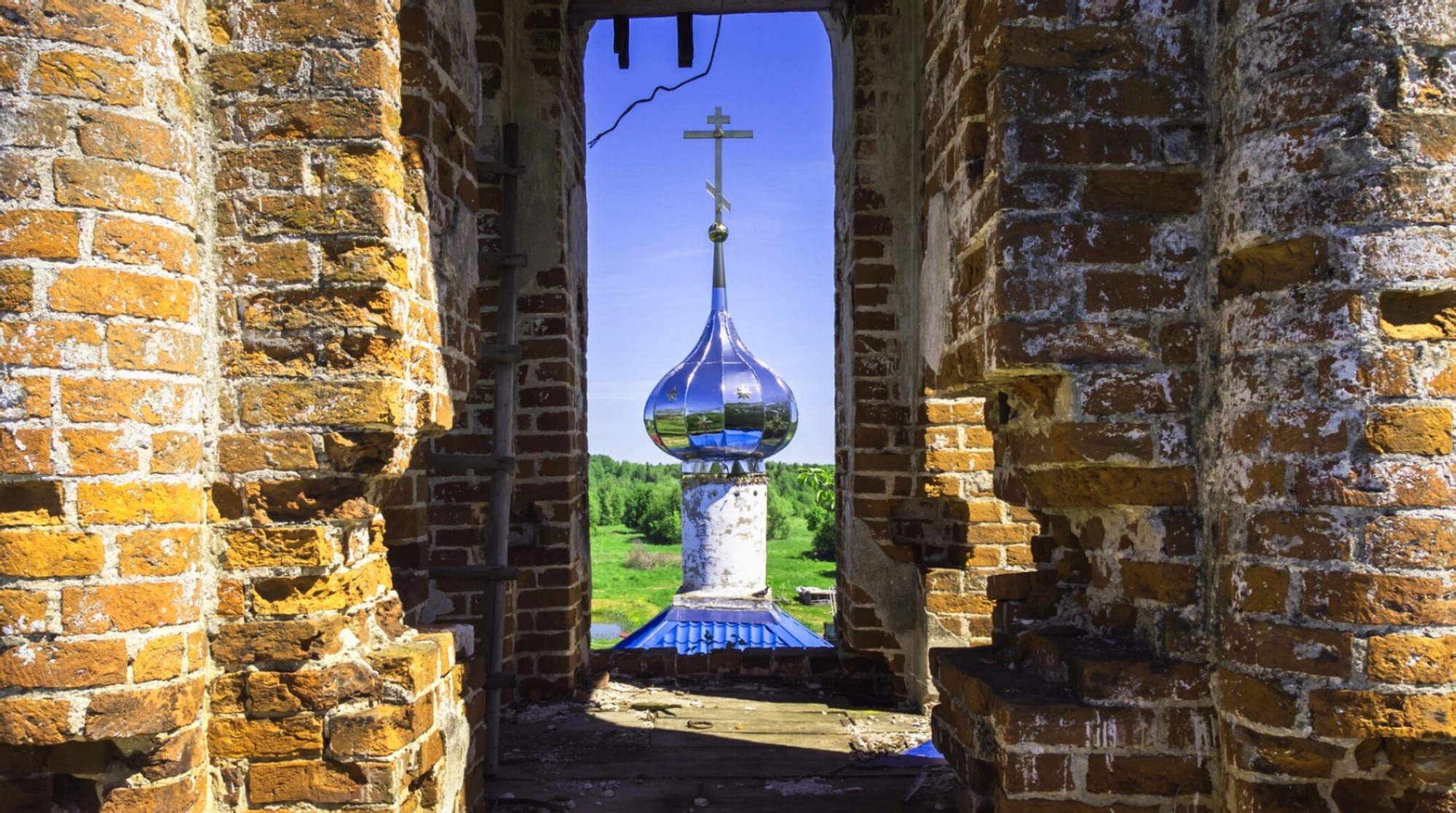 На фотографии запечатлён уникальный вид на купол и крест Церкви Введения Пресвятой Богородицы в селе Павловка Любимского района Костромской области. Снимок сделан изнутри разрушенной колокольни храма, через арочный проём в кирпичной кладке, который обрамляет главную главу церкви, увенчанную православным крестом. Этот композиционный приём символически представляет земную разруху, через которую проступает вечная красота домов Божиих.