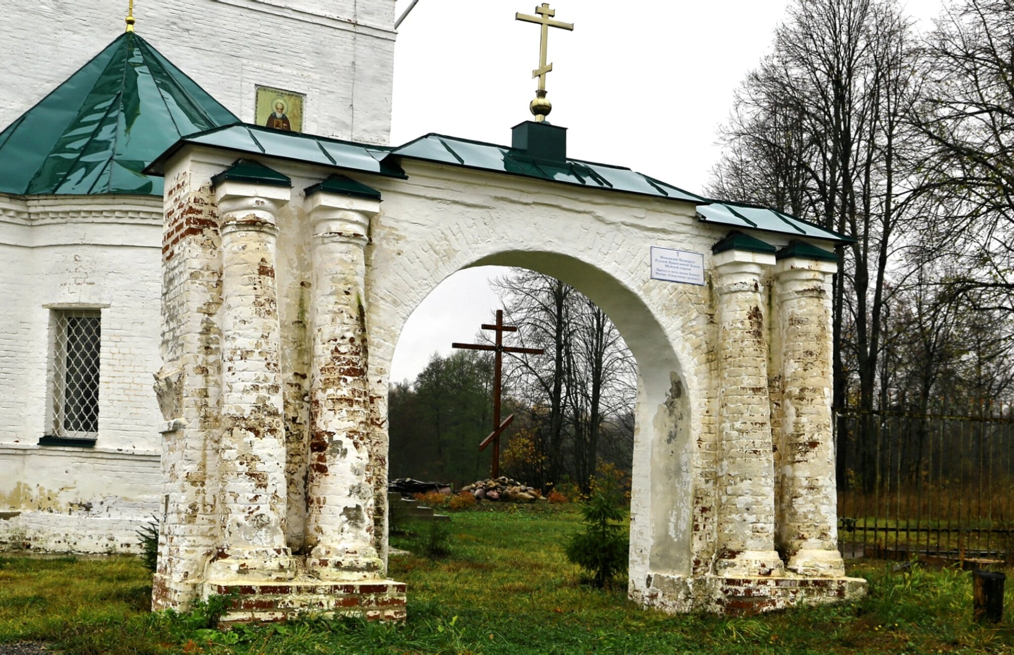 На представленной фотографии запечатлён храмовый комплекс в деревне Зимёнки Шуйского района Ивановской области. Центральное место на снимке занимает входная группа с массивной белокаменной аркой, ведущей на территорию церковного подворья. Арка выполнена в традициях православного зодчества и увенчана двускатной кровлей зелёного цвета с установленным наверху православным крестом.
