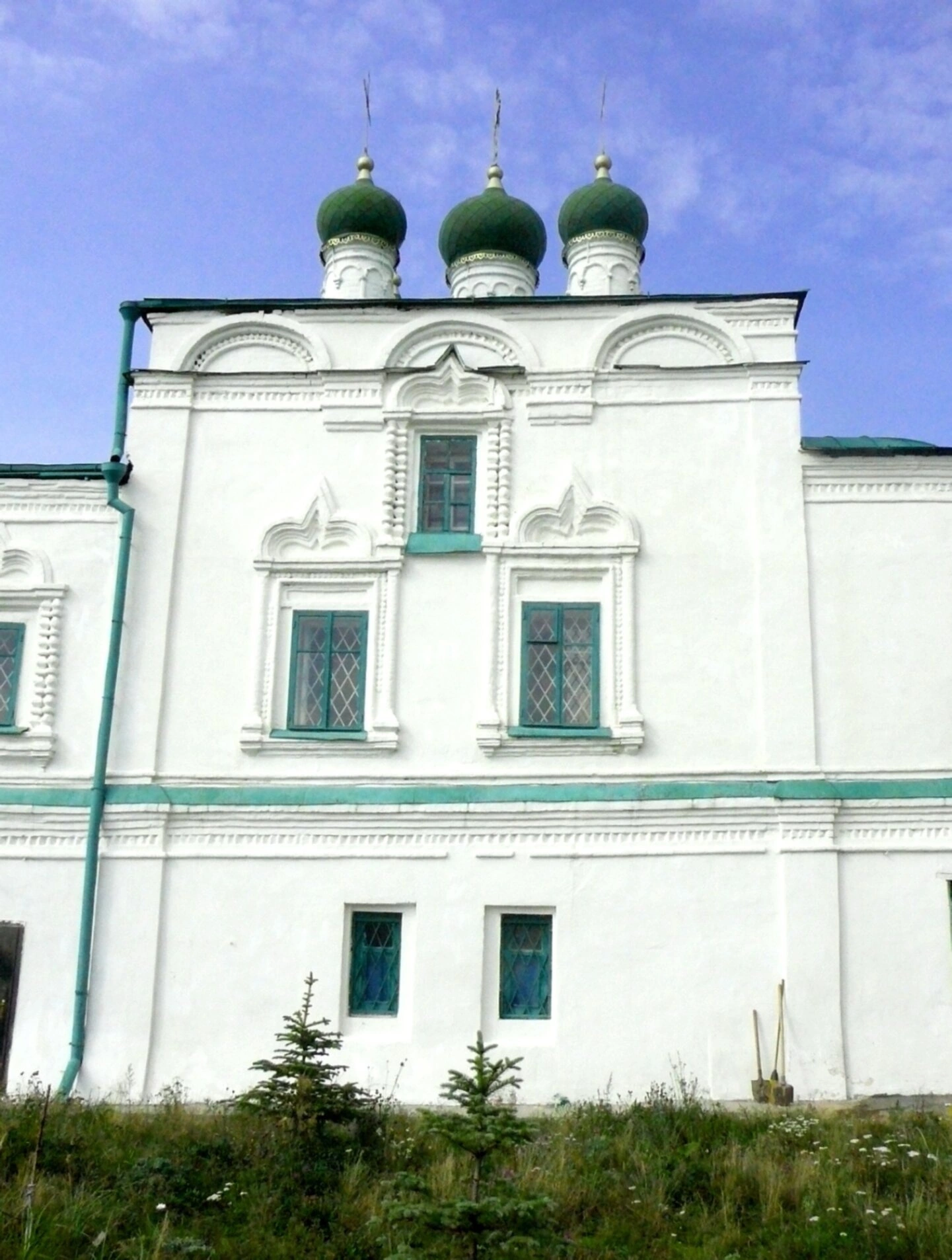 Фасад храма, выполненный из белого камня и кирпича, демонстрирует характерные для русской церковной архитектуры XVII века детали. Окна украшены наличниками с килевидными завершениями и колонками, а в верхней части стены видны декоративные кокошники, напоминающие о пламенной молитве и ангельском предстоянии. Зелёные оконные рамы и элементы водосточной системы гармонично сочетаются с цветом куполов, создавая целостный образ.