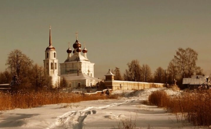 Общая атмосфера снимка пронизана тихим, благоговейным спокойствием. Серовато-желтое небо, окрашенное в предзакатные или предрассветные тона, наполняет пейзаж мягким, рассеянным светом, символизирующим нетварный свет Божественной славы. Деревья без листвы по сторонам храма и небольшое деревянное строение, укрытое снегом, дополняют картину суровой русской зимы, в которой церковь предстает неизменным оплотом тепла, веры и надежды для человеческой души.