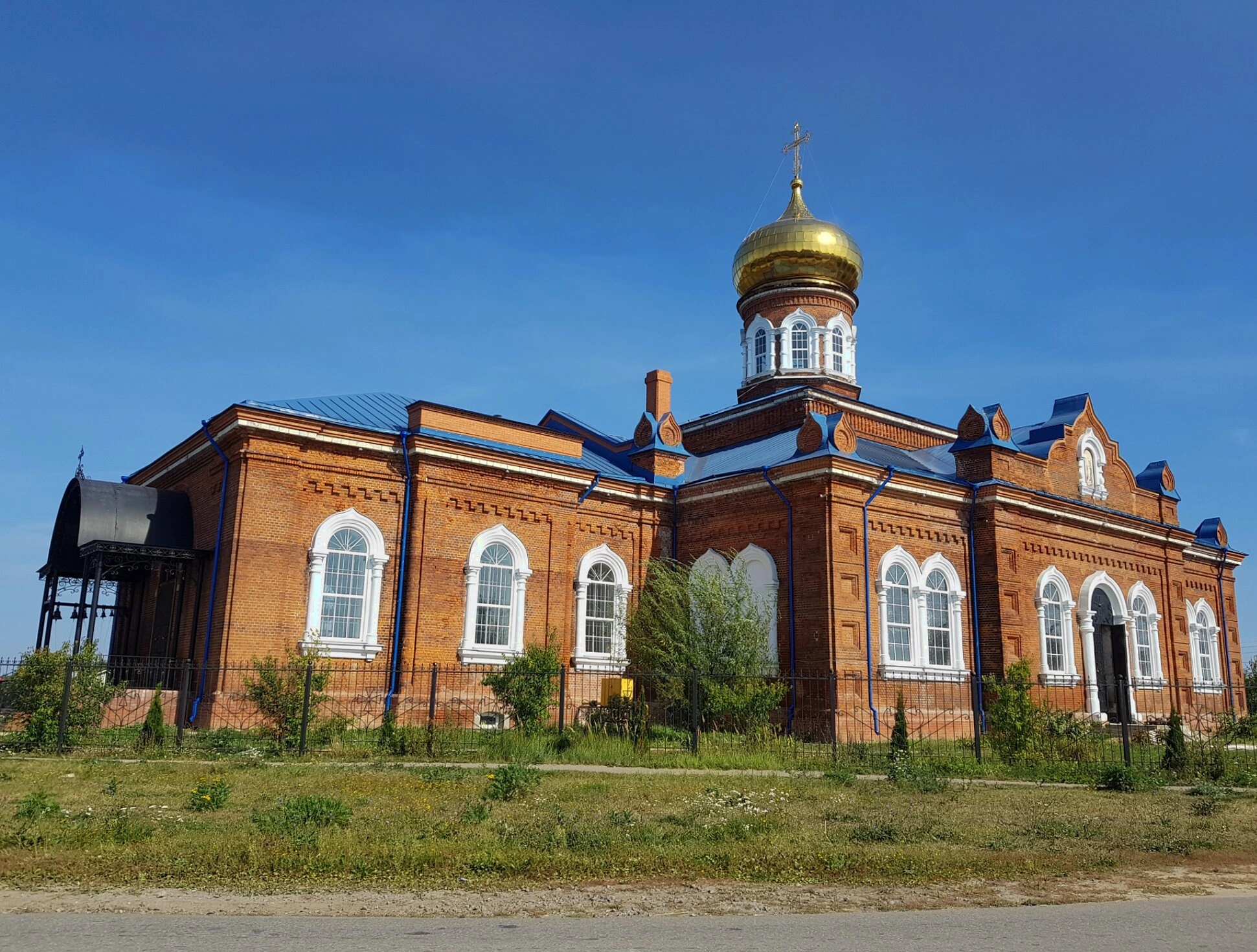 На переднем плане фотографии видна грунтовая дорога, ведущая к храму. Территория вокруг церкви огорожена невысоким металлическим ограждением. Перед зданием растут густая трава, кустарники и молодые деревья, что подчёркивает сельскую атмосферу места.