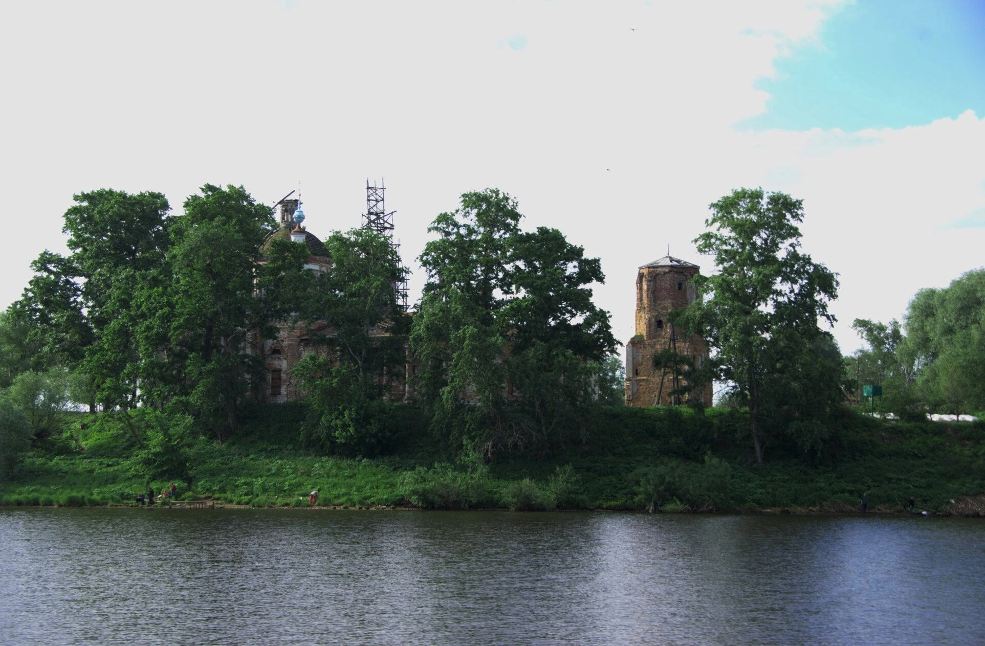 На переднем плане фотографии видна водная гладь реки Оки, а у подножия холма, на котором возвышается церковь, заметны фигуры людей, что позволяет оценить масштаб сооружения. Историческая ценность данного храма подтверждается его включением в реестр объектов культурного наследия Луховицкого района.