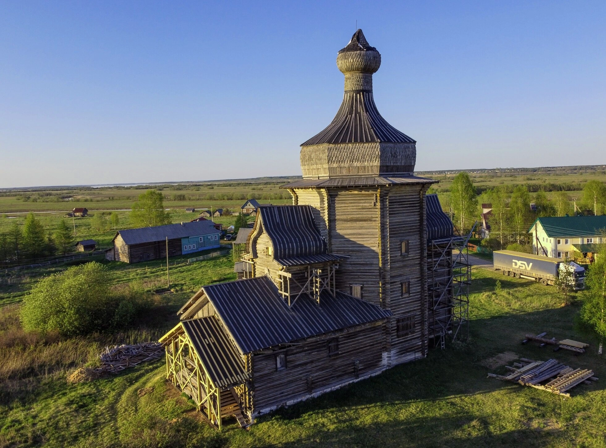 На фотографии хорошо просматривается конструкция храма, демонстрирующая мастерство северных плотников. Особый интерес представляют традиционные элементы деревянной архитектуры: форма кровли, устройство главки и конструкция стен. Храм является объектом культурного наследия и находится под охраной государства как памятник федерального значения.