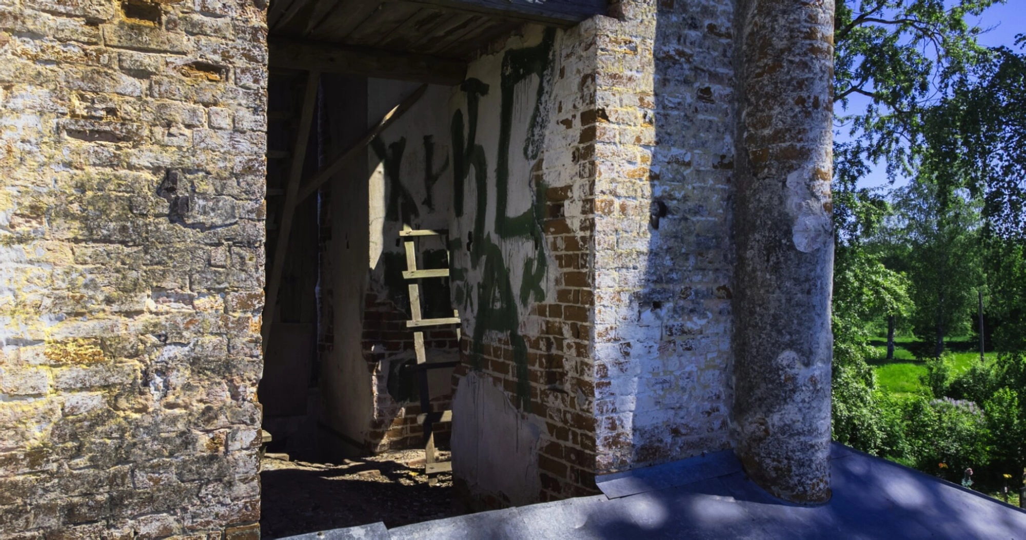 На фотографии запечатлен фрагмент стены Церкви Введения во храм Пресвятой Богородицы, расположенной в селе Павловка Любимского района Ярославской области. Каменная Введенская церковь была построена в 1774 году и является уникальным памятником православной культуры, сохранившим богослужения даже в советский период. Изначально храм был деревянным, но к 1835 году обрел три придела: главный — в честь Введения Божией Матери, и боковые — во имя святителя Николая Чудотворца и преподобного Геннадия Любимоградского.