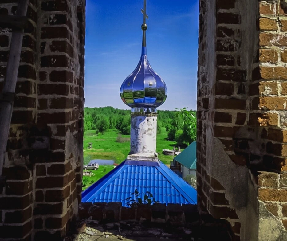 На фотографии запечатлен уникальный ракурс Церкви Введения во храм Пресвятой Богородицы, расположенной в селе Павловка Любимского района. Снимок выполнен изнутри старинной кирпичной постройки, возможно, колокольни, через арочный проем в стене, что создает эффект естественного обрамления и подчеркивает историческую ценность архитектурного комплекса.