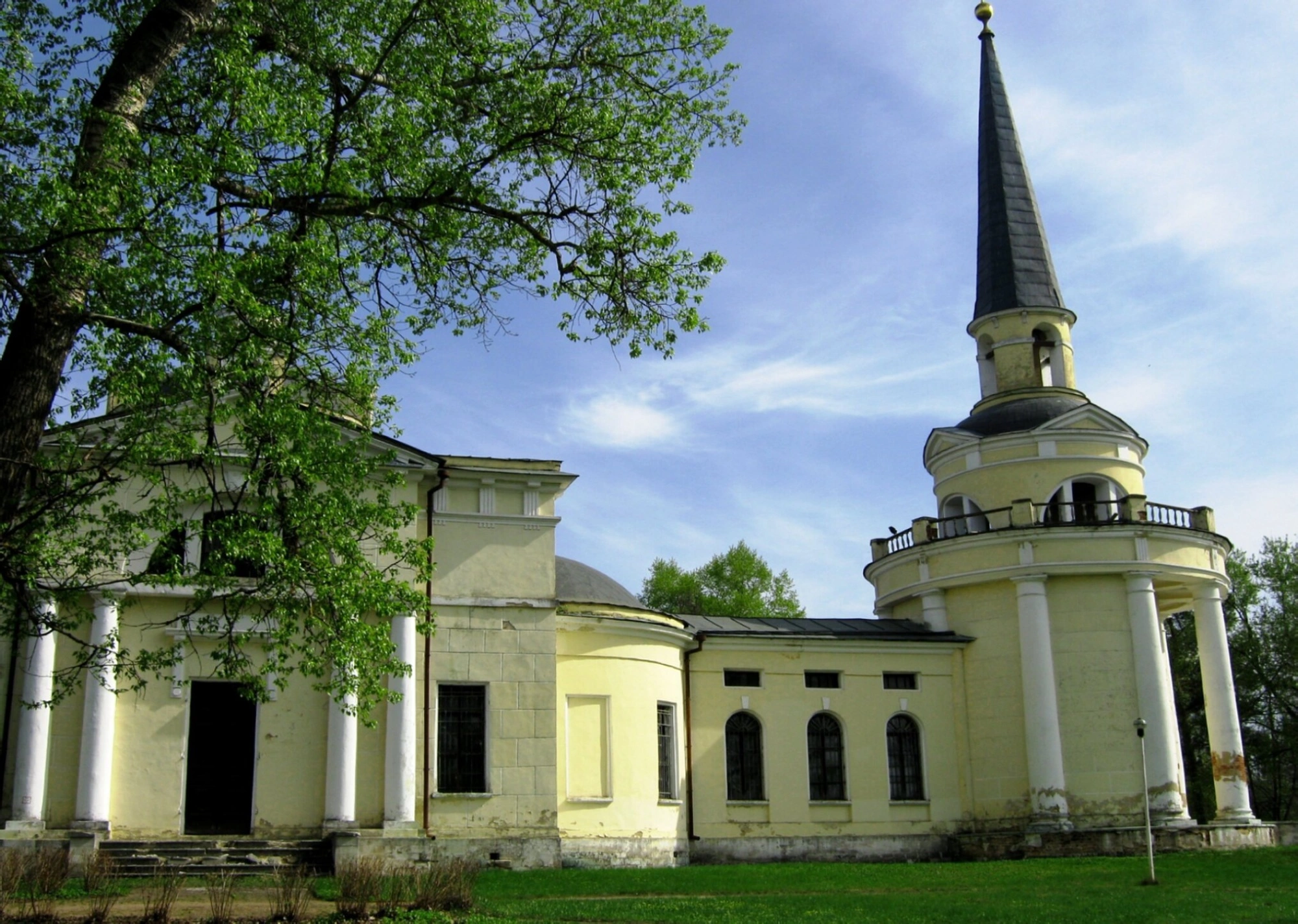 Белоснежный храм с жёлтыми стенами величественно возвышается на живописном берегу Москвы-реки. Его архитектура, созданная по проекту знаменитого зодчего Николая Александровича Львова, представляет собой блестящий образец классицизма. Центральный объём выполнен в форме ротонды, увенчанной высоким шпилем с золочёным крестом, устремлённым в небеса. Изящные колонны коринфского ордера и строгие портики придают сооружению особую торжественность и благородство.