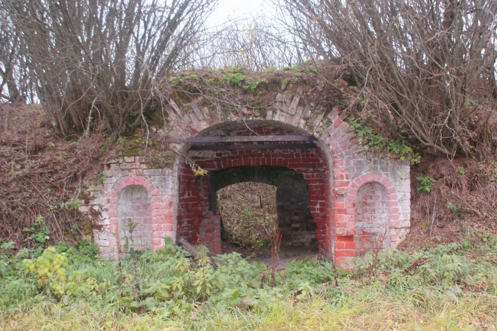 Основной композиционный центр кадра занимает величественный, хотя и полуразрушенный, арочный портал, который служил главным входом в храм. Кладка выполнена из красного кирпича с декоративными элементами и окантовками из белого камня, что характерно для архитектурных традиций данного региона периода классицизма. По сторонам от центральной арки симметрично расположены две меньшие арочные ниши, усиливающие ощущение ритма и монументальности фасада. Над проёмом сохранилась массивная деревянная балка – немой свидетель былой конструкции.