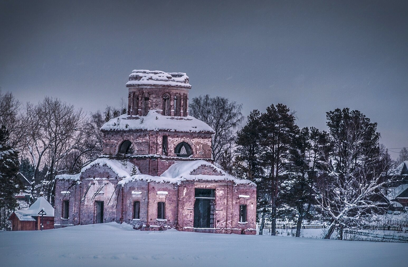 Снимок сделан в зимний период, когда глубокий снежный покров покрывает землю и кровлю храма, а иней украшает окружающие деревья. Пасмурное освещение или время сумерек придает изображению особую атмосферу умиротворения и легкой грусти, подчеркивая историческую ценность этого памятника православной культуры.