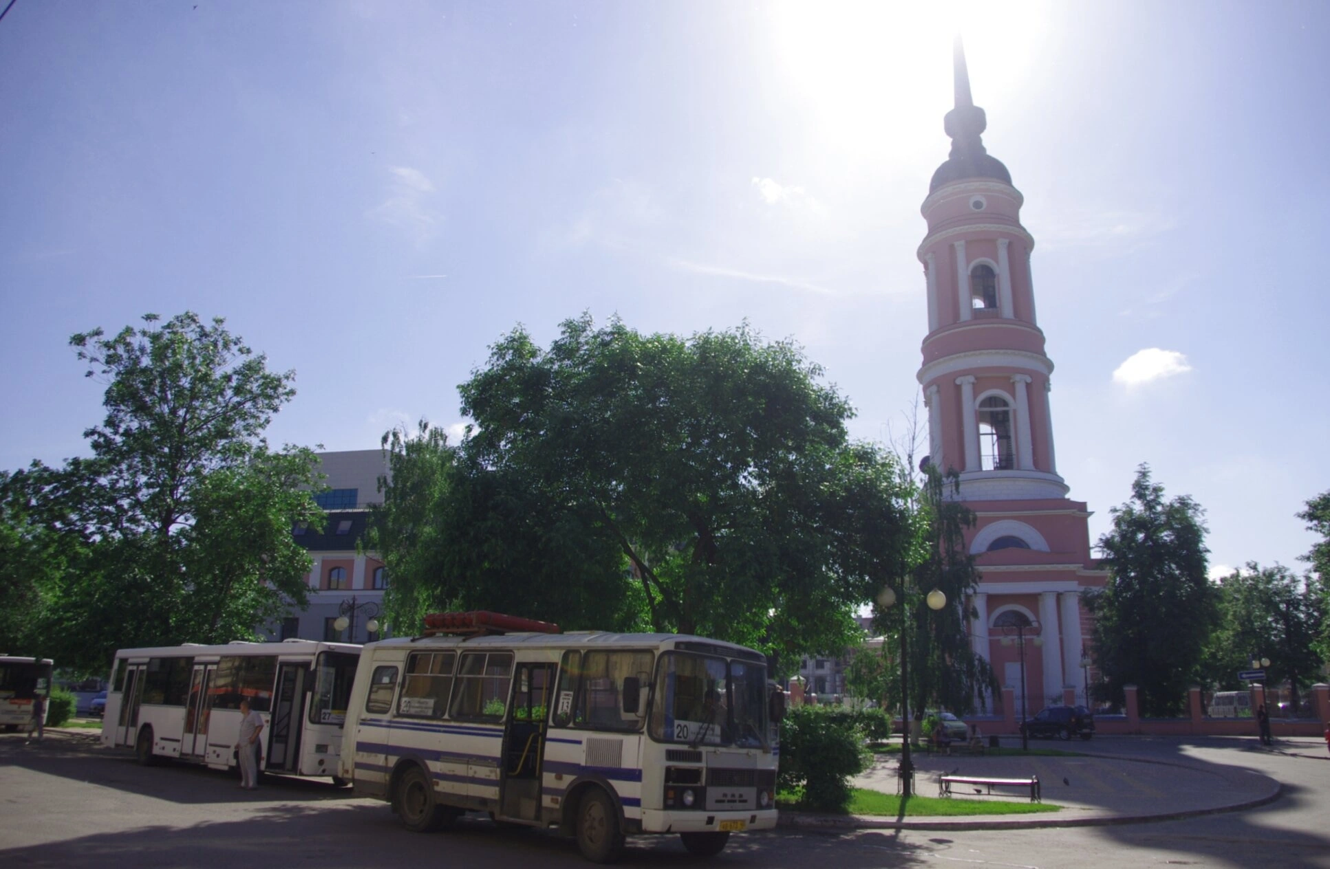 На фотографии запечатлён вид на старинный православный храм — Церковь Святых Жён-Мироносиц, что располагается в историческом центре города Калуги. Белоснежные стены и зелёные кровли храма ярко выделяются на фоне городского пейзажа, а стройная колокольня с высоким шпилем устремляется в небо, являясь важной архитектурной доминантой этой части города.