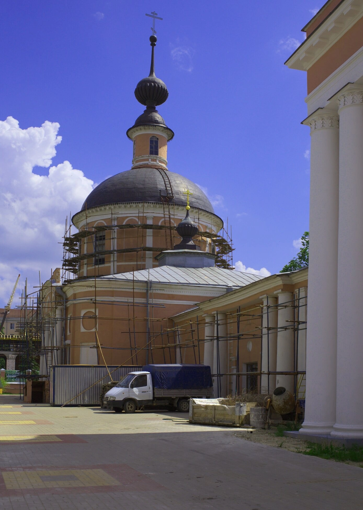 Главный купол, увенчанный традиционным православным крестом, в момент съёмки был скрыт реставрационными конструкциями, что говорит о важных работах по сохранению этого духовного и архитектурного памятника. На переднем плане фотографии видна прихрамовая территория с необходимыми для ремонта материалами и техникой, что не нарушает общей благоговейной атмосферы, а, напротив, подчёркивает непрерывную заботу верующих о своём храме. Ясное небо с кучевыми облаками служит прекрасным фоном, highlighting красоту и монументальность святого места.