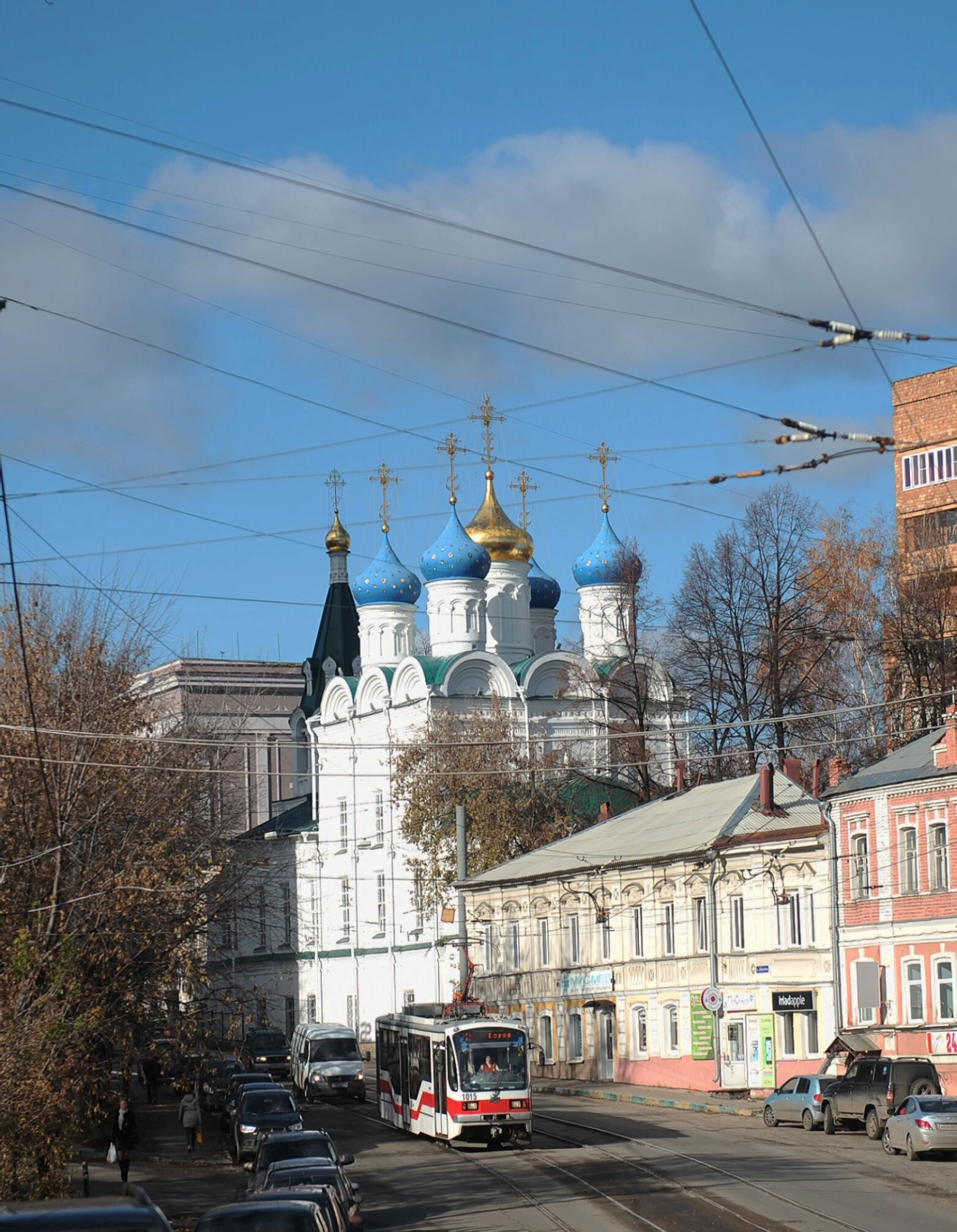 На переднем плане фотографии видна оживлённая городская жизнь: трамвайные пути, по которым следует вагон, припаркованные automobiles и пешеходы. Это подчёркивает, что древний храм органично существует в современном городском пространстве, оставаясь действующим духовным центром и важнейшим памятником истории и культуры.