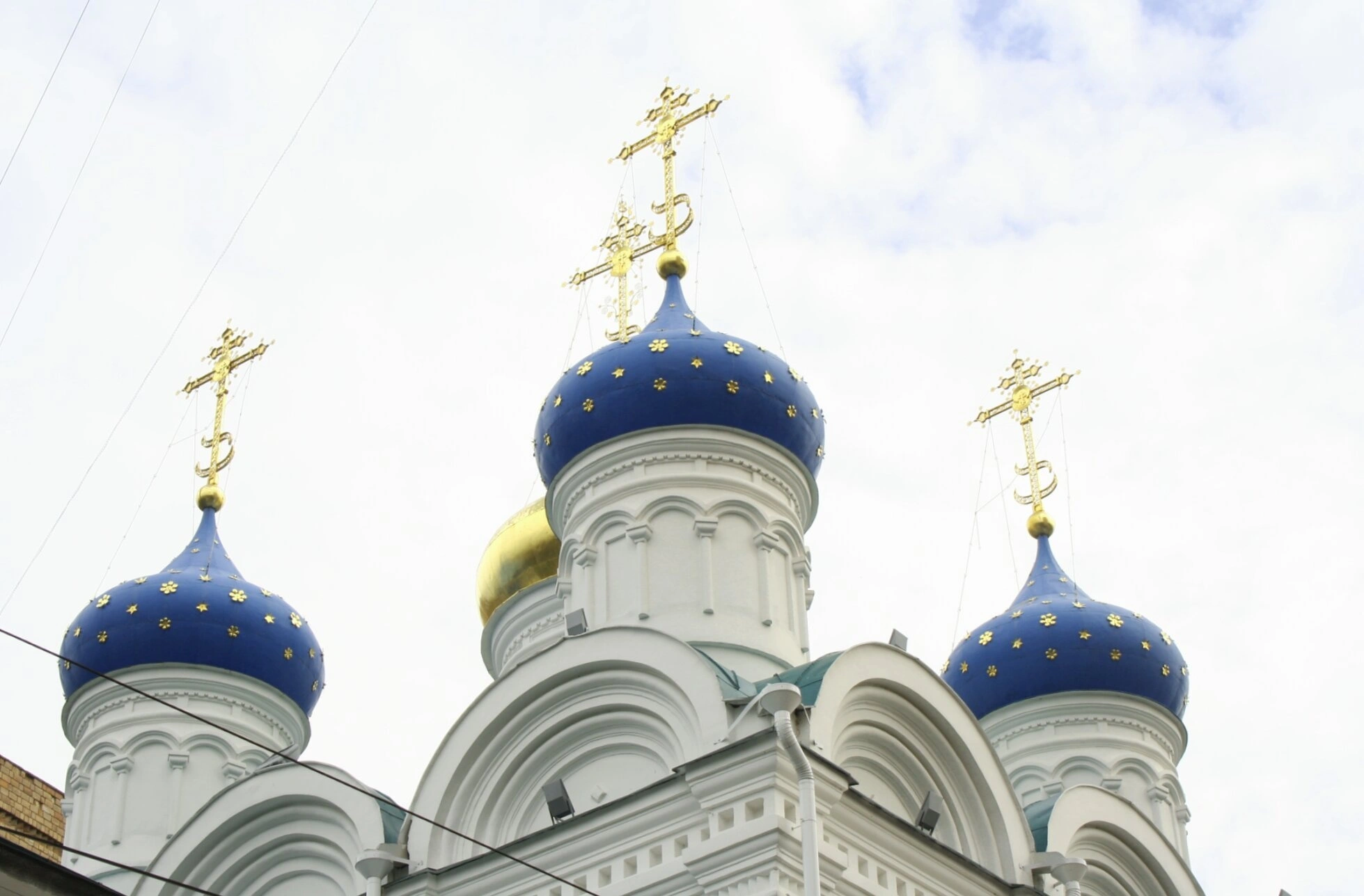 Храм был возведён в 1649 году на месте ранее существовавшей деревянной церкви. Пятиглавое завершение храма символизирует Иисуса Христа в окружении четырёх евангелистов. На фотографии хорошо видны три из пяти куполов, имеющих характерную синюю окраску с золотыми звёздами и увенчанных золочёными крестами. Такое цветовое решение имеет глубокое духовное значение: синий цвет символизирует небесную чистоту, а золотые звёзды напоминают о Вифлеемской звезде.