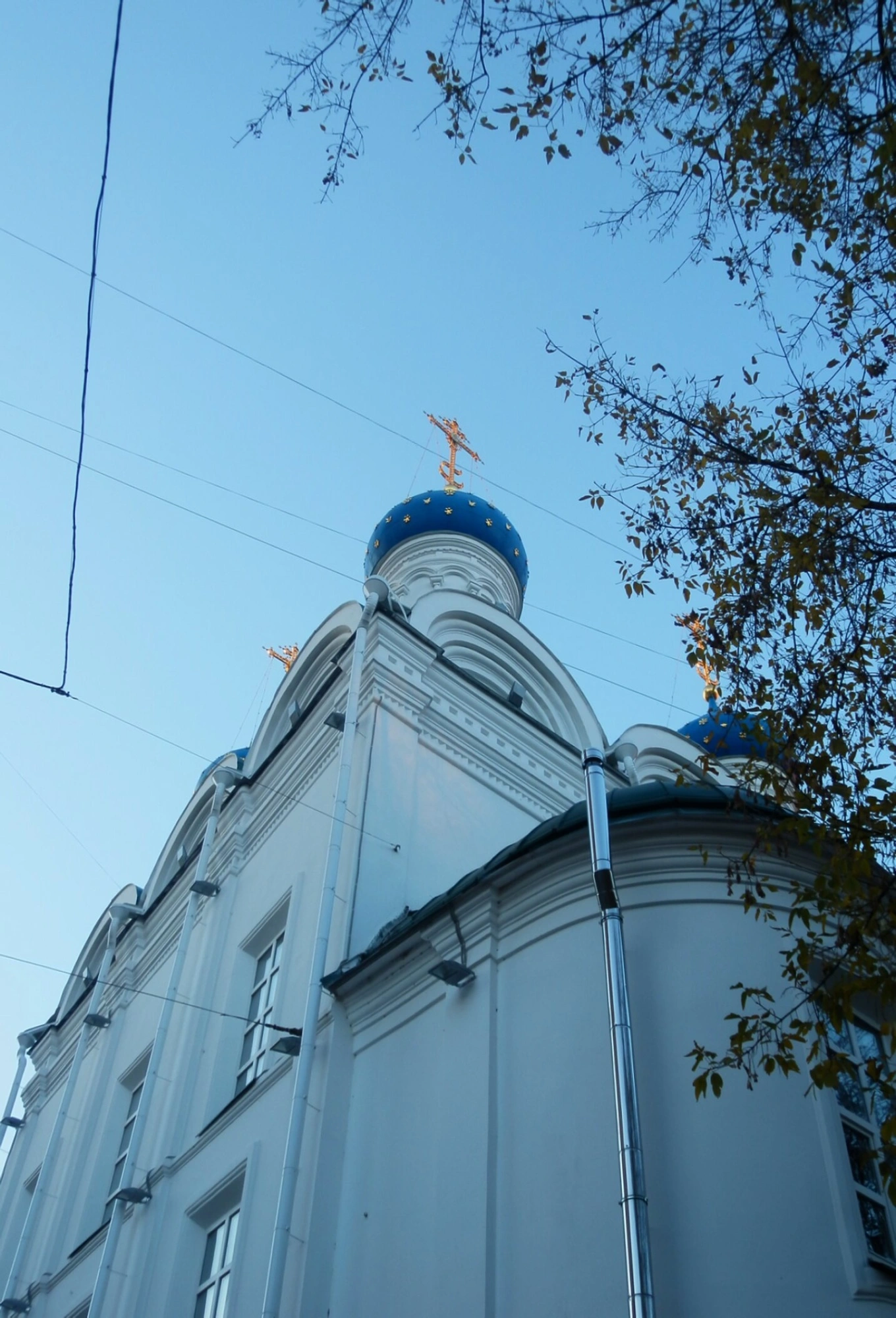 Белоснежный каменный храм возвышается над городской застройкой, демонстрируя характерные для своего времени архитектурные формы. Особое внимание привлекает нарядный синий купол, украшенный золотыми звёздами и увенчанный позолоченным крестом, который символизирует победу жизни над смертью. Фотография выполнена с нижнего ракурса, что позволяет в полной мере оценить монументальность сооружения и изящество декоративного убранства.
