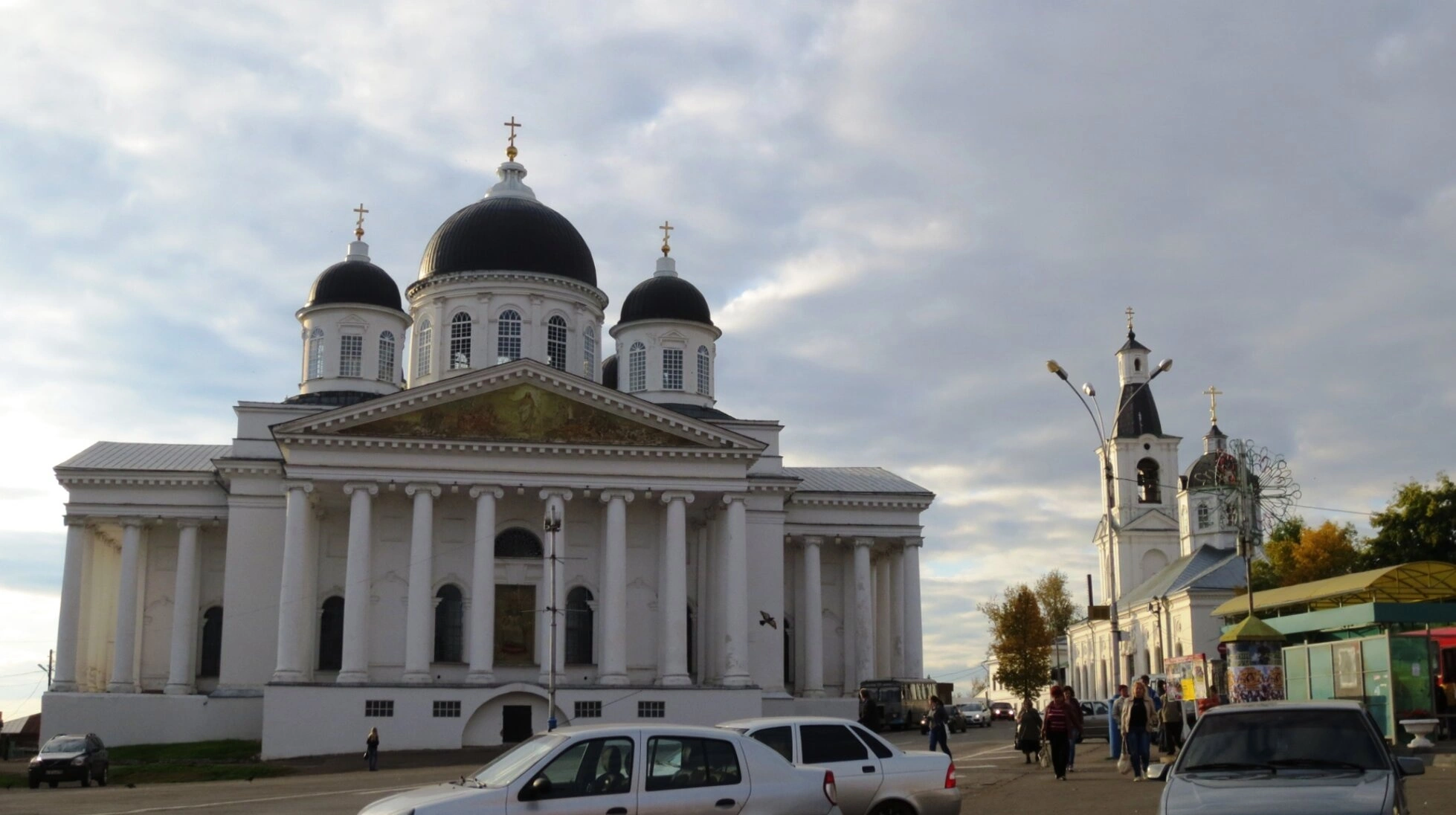 На представленной фотографии запечатлена Церковь Живоносного Источника, расположенная в историческом центре города Арзамаса Нижегородской области. Храм находится в непосредственной близости от величественного Воскресенского собора, составляя с ним единый архитектурный ансамбль Соборной площади.