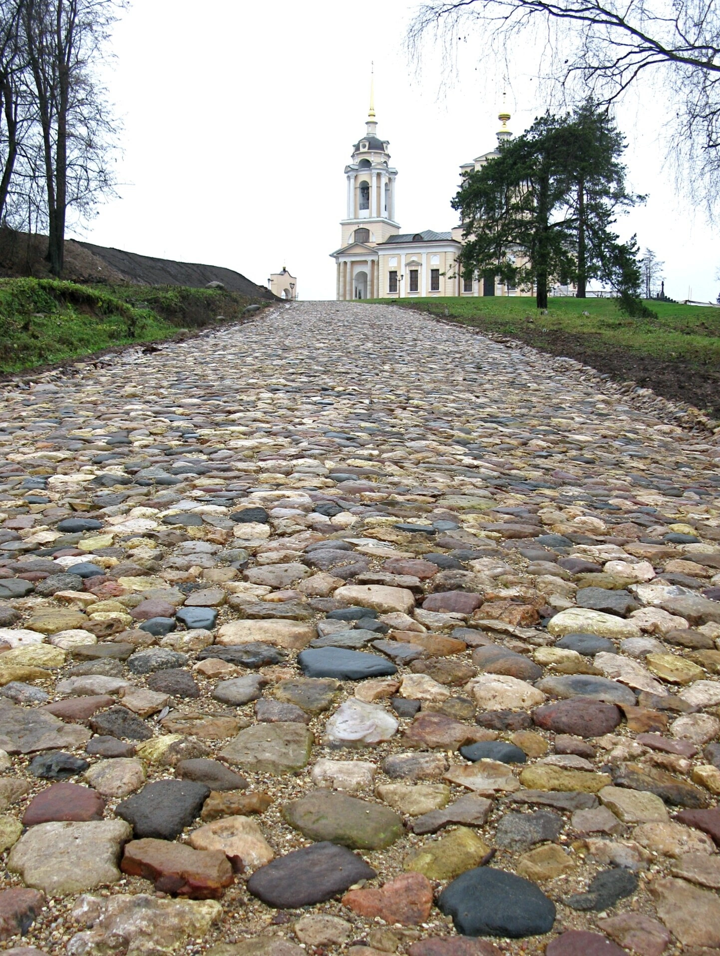 На представленной фотографии запечатлён южный фадел Церкви Знамения Пресвятой Богородицы, что расположена в селе Комлево Рузского городского округа Московской области. Храм возвышается на живописном берегу реки Рузы, а на переднем плане снимка видна историческая мощёная булыжником дорога, ведущая от Святых ворот к самой реке.