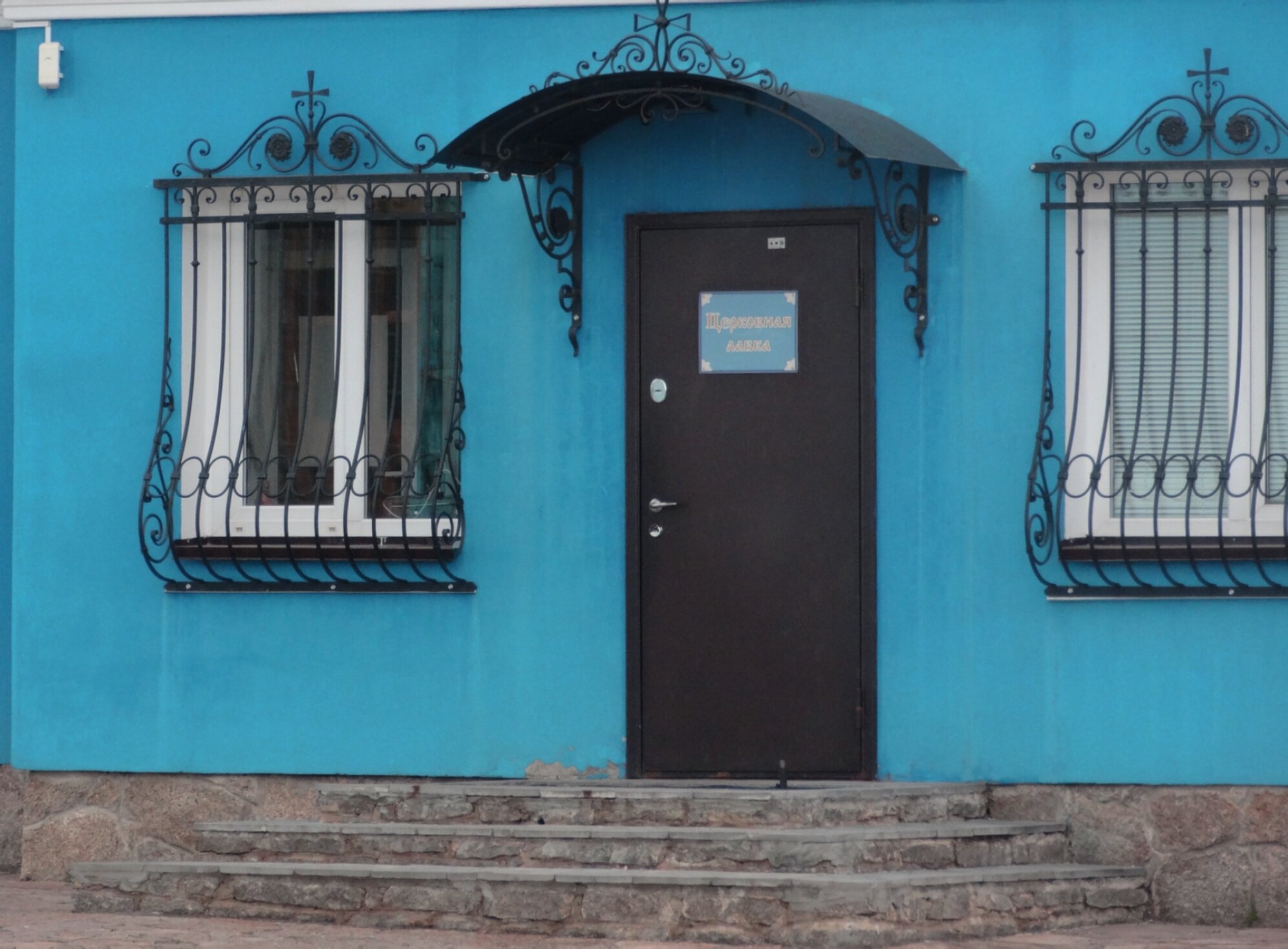 В центре композиции располагается темная входная дверь, над которой укреплен изящный кованый козырьк. Непосредственно над дверью размещена табличка с четкой надписью «Церковная лавка», указывающая на предназначение данного строения. По обе стороны от входа симметрично расположены оконные проемы, надежно защищенные ажурными коваными решетками, которые не только выполняют охранную функцию, но и служат украшением, демонстрируя высокий уровень кузнечного мастерства.