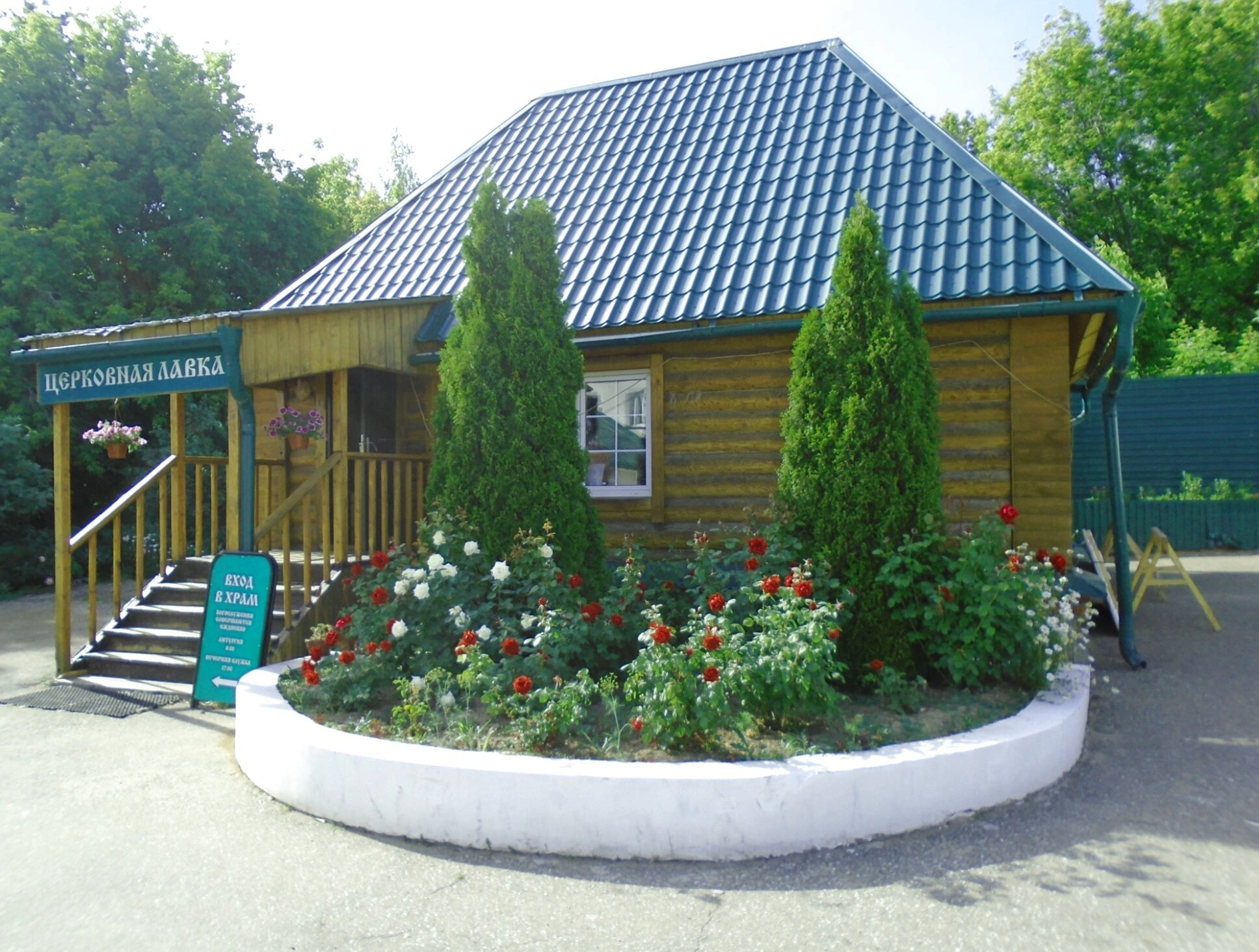 У подножия лестницы установлена благочестивая табличка-указатель со стрелкой и надписью «ВХОД В ХРАМ», направляющая верующих к месту молитвы. Особое внимание привлекает ухоженный цветник, разбитый перед зданием лавки. Он украшен кустами роз, цветущих белыми и алыми цветами, что символизирует чистоту Божией Матери и мученическую кровь святых угодников. Два высоких хвойных дерева, стоящих по сторонам, являются олицетворением духовной стойкости и вечной жизни.