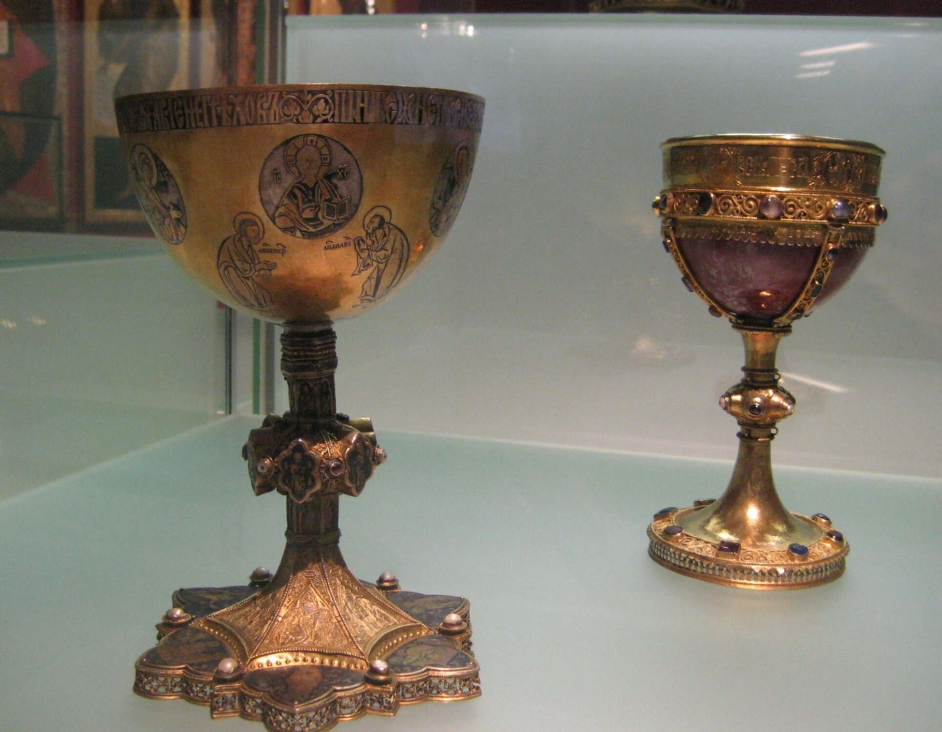 Сосуд справа, меньший по размеру, отличается изысканностью и тонкостью работы. Его поверхность инкрустирована драгоценными камнями или художественной эмалью, что свидетельствует о высоком статусе мастерской, в которой он был создан. Такой потир мог принадлежать домовому храму или использоваться для особых случаев.