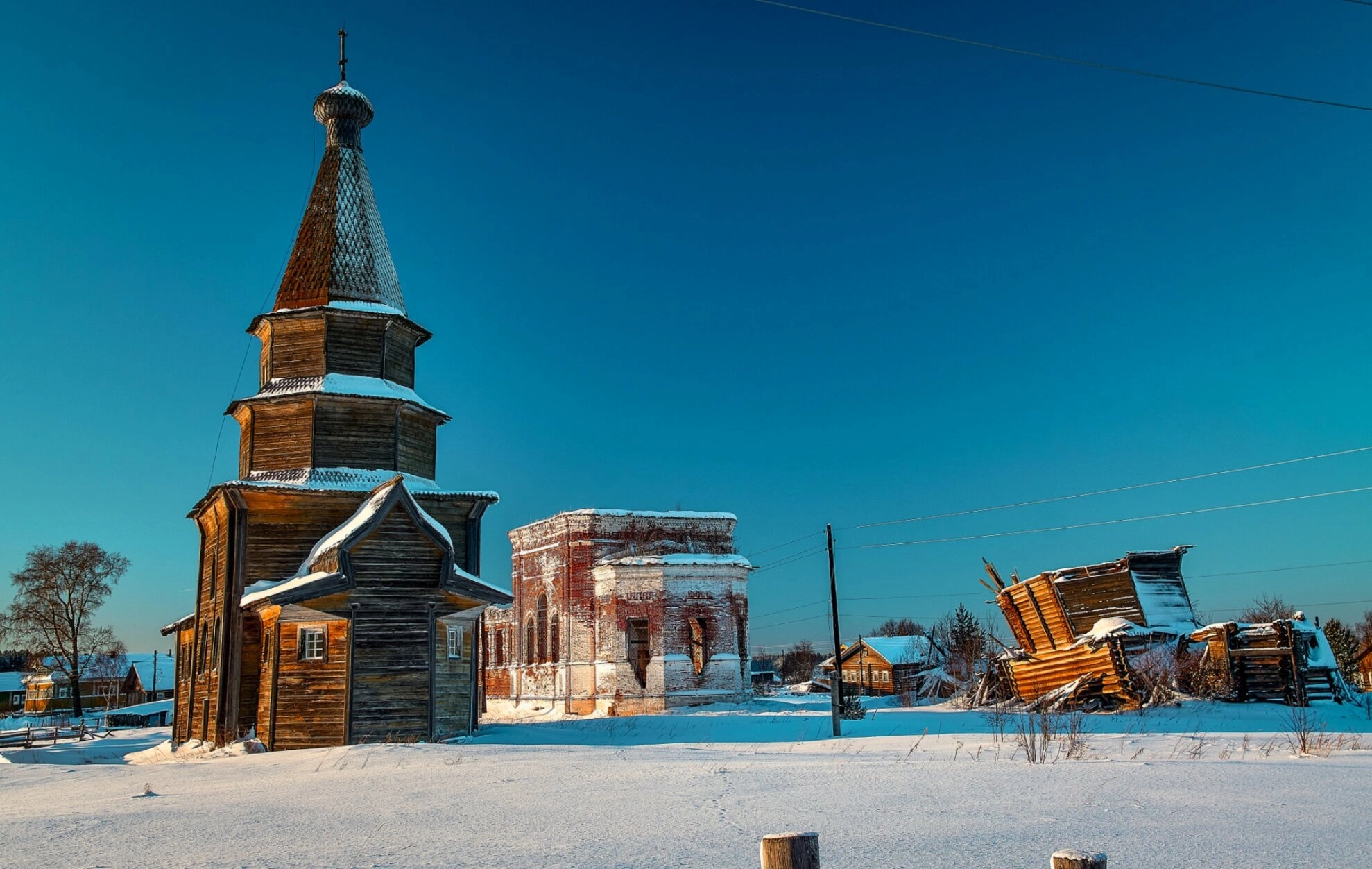 На заднем плане фотографии просматриваются скромные сельские дома и лишенные листвы деревья, характерные для зимнего пейзажа Русского Севера. Ясное небо ярко-синего цвета создает контраст с белоснежным покровом земли, усиливая выразительность архитектурных форм и драматичность сцены.