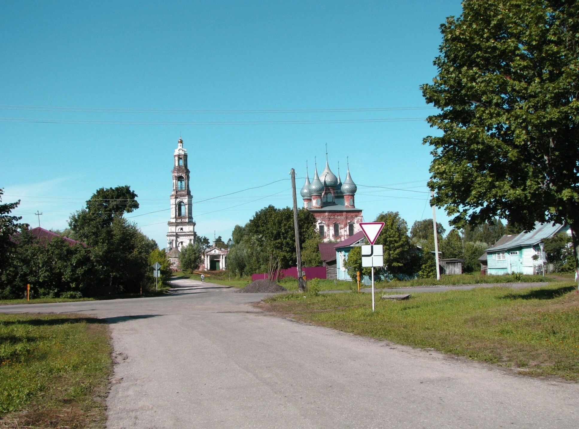 На переднем плане фотографии видна грунтовая дорога, ведущая вглубь села. По обеим сторонам от неё растут деревья и кустарники, создавая естественное обрамление для архитектурного ансамбля. Вдали просматриваются традиционные деревянные сельские дома, составляющие типичный пейзаж русской деревни.