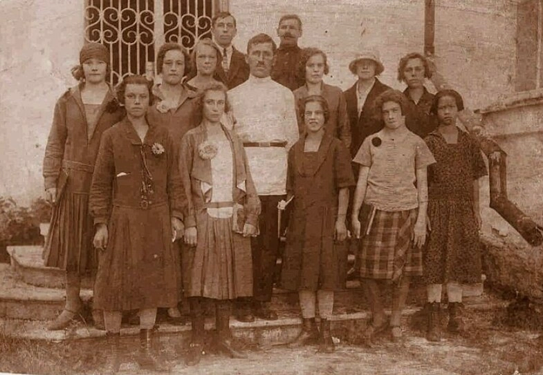 На исторической фотографии запечатлён церковный хор храма Преображения Господня в Екатеринбурге, относящийся к началу 1920-х годов. На снимке изображена группа из пятнадцати человек, включая регента и певчих, стоящих на ступенях перед зданием храма. В центре композиции находится регент хора в светлой рубахе и тёмных брюках, окружённый преимущественно молодыми певчими женского пола. Несколько мужчин расположены на заднем плане, что отражает традиционное разделение голосов в православном церковном хоре.