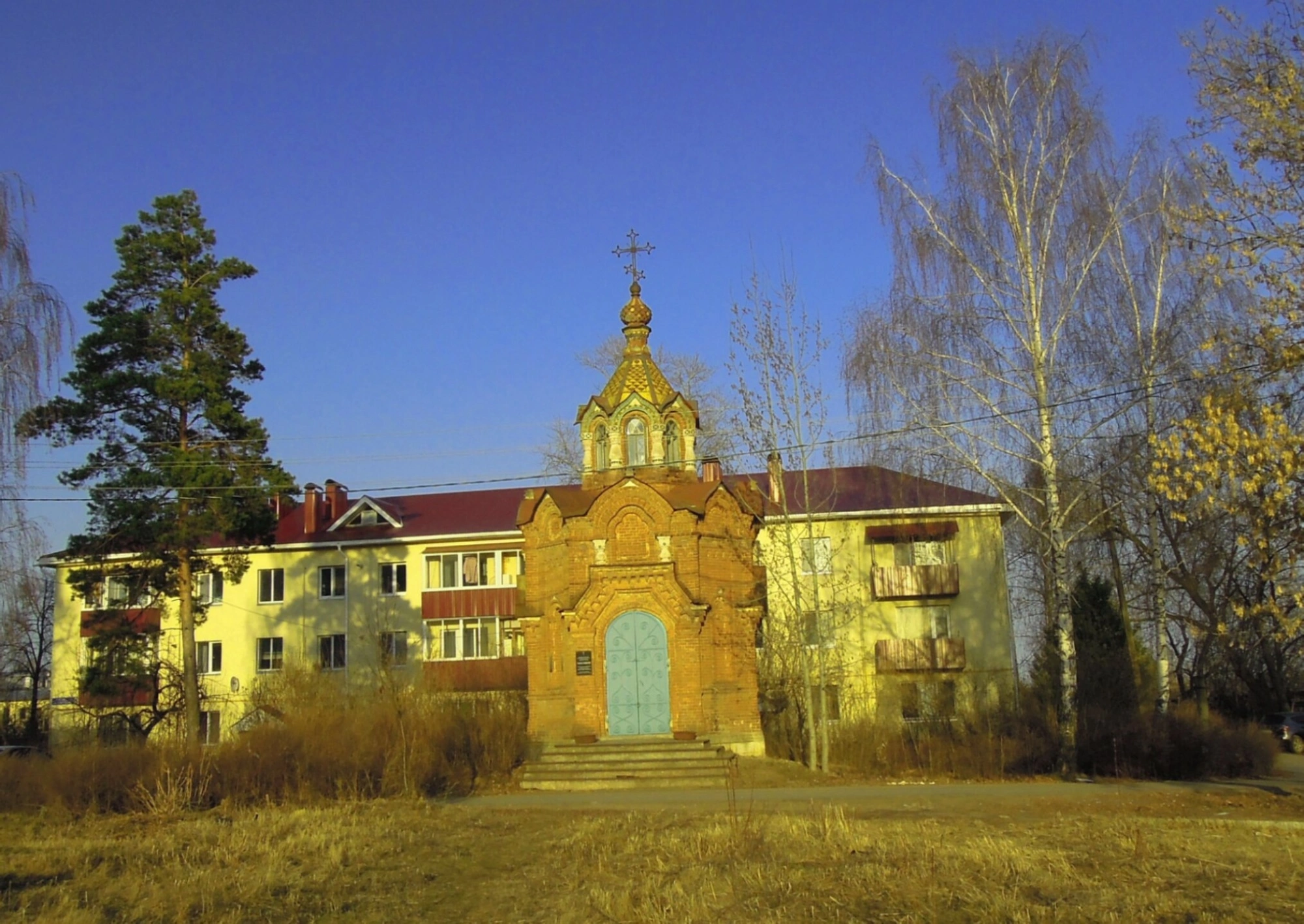 На фотографии часовня расположена между двумя более крупными зданиями светлого оттенка с красными крышами. Вокруг растут деревья: слева выделяется высокое хвойное дерево, справа – лиственные. Земля покрыта сухой травой. Снимок сделан в ясный солнечный день, что подчеркивает чистоту линий и насыщенность цветов.