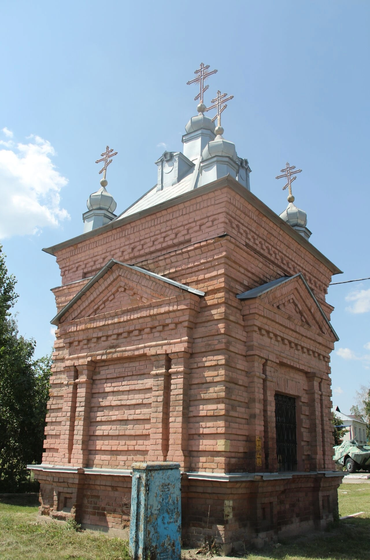 Часовня окружена зелёным травяным покровом и деревьями. На переднем плане фотографии виден старый синий ящик, что придаёт снимку бытовой контекст. На заднем плане справа просматриваются очертания какого-то транспорта или хозяйственной постройки. Людей на фотографии крупным планом нет.