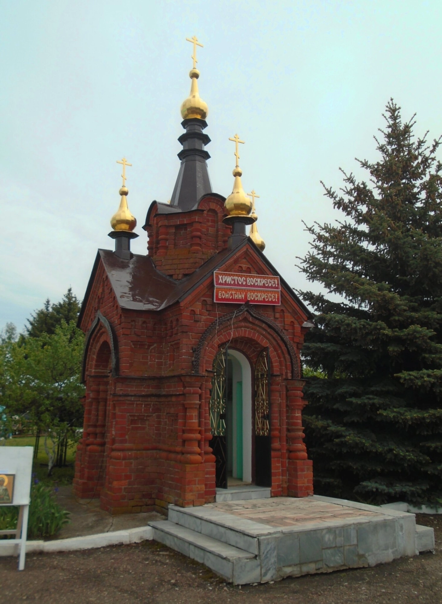 Над входом в часовню размещена благодарственная табличка с пасхальным приветствием «ХРИСТОС ВОСКРЕСЕ! ВОИСТИНУ ВОСКРЕСЕ!», напоминающая о торжестве жизни над смертью. Арочный вход, обрамлённый кирпичной кладкой, ведёт верующих в дом молитвы, к которому восходят каменные ступени.