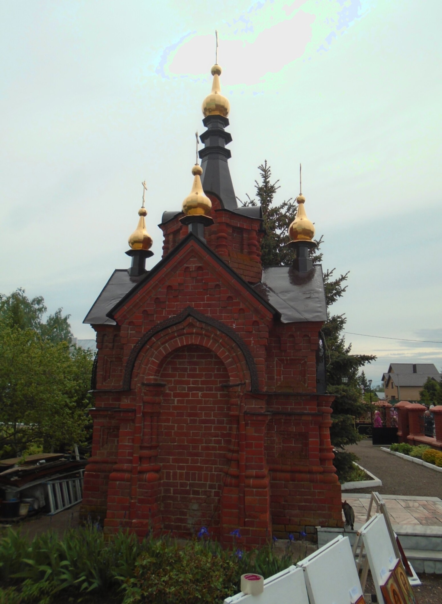 Часовня окружена благоустроенной территорией, где ухоженная зелень и деревья создают атмосферу духовного умиротворения. К входу ведет аккуратно вымощенная дорожка, что подчеркивает заботу местной общины о сохранении этой святыни. На переднем плане фотографии видны мольберты, свидетельствующие о проведении в этом благодатном месте пленэра или художественного мероприятия, что говорит о культурном значении часовни не только как религиозного объекта, но и как источника вдохновения для творческих людей.