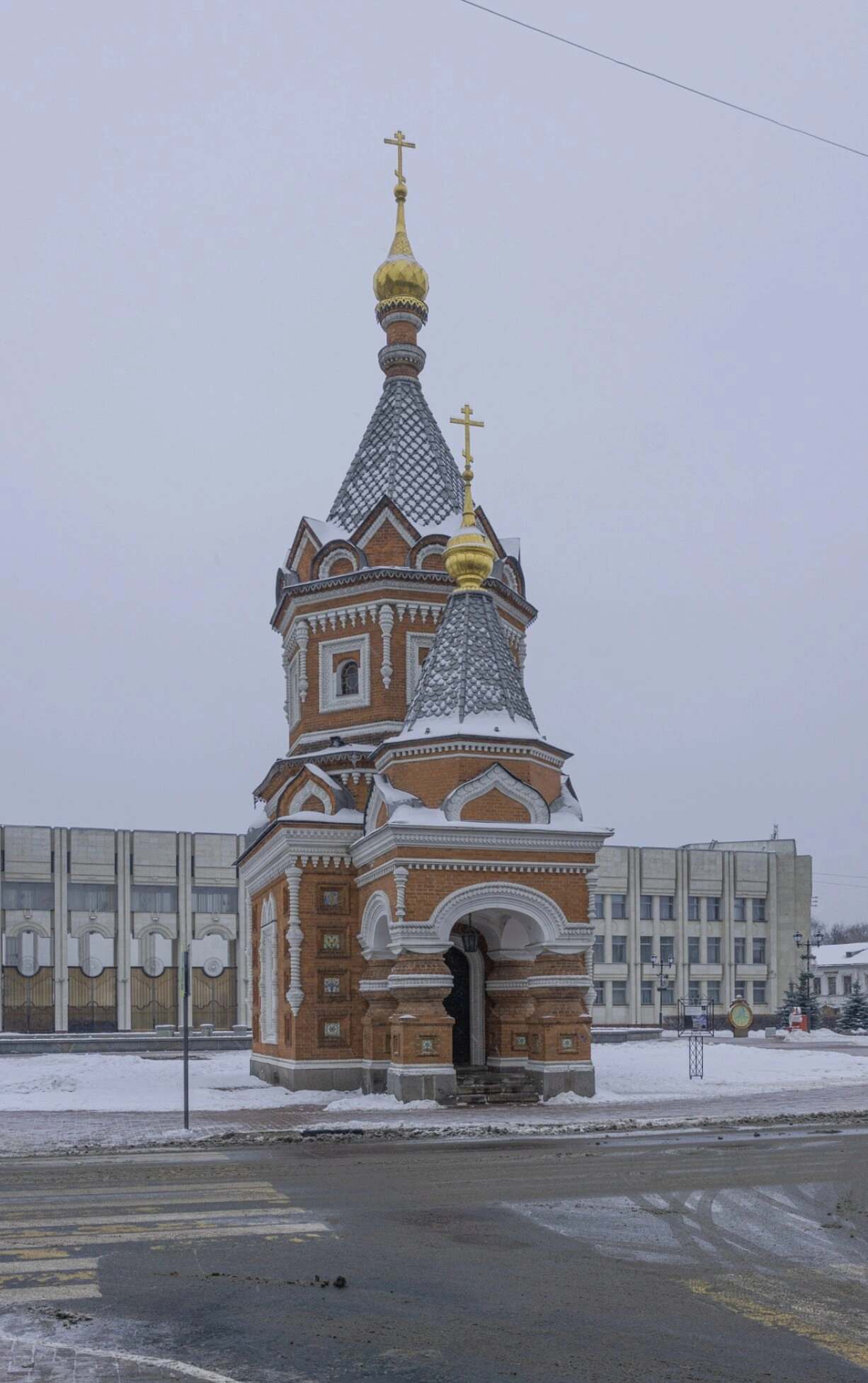 На представленной фотографии запечатлена часовня во имя святого благоверного князя Александра Невского, расположенная в историческом центре Ярославля. Святая обитель была воздвигнута в 1889 году в память о чудесном спасении императора Александра III и его августейшей семьи во время крушения императорского поезда на станции Борки.