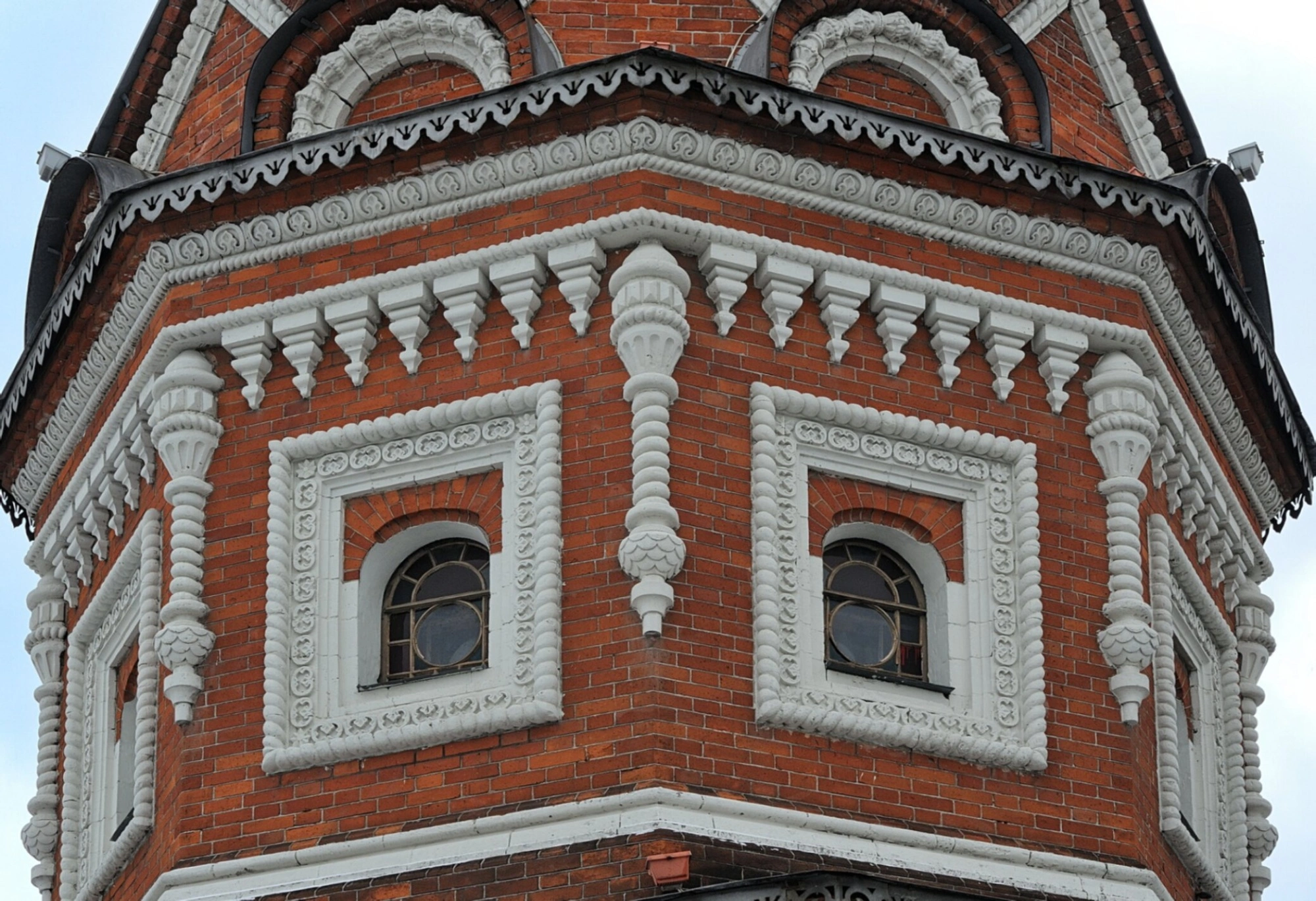 Фасад богато украшен архитектурным декором: арочные оконные проёмы обрамлены фигурными наличниками с лепниной, между окнами расположены витые колонны, придающие сооружению особую выразительность. Верхняя часть здания завершается сложным профилированным карнизом, украшенным орнаментальными кокошниками и традиционными узорами, характерными для православного храмового строительства.